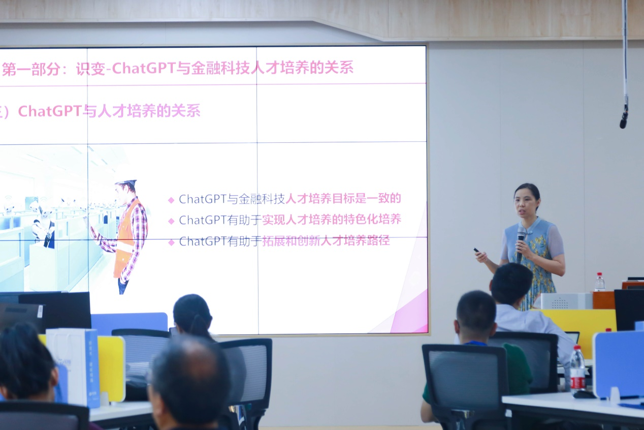 随后,taptap点点金融学院院长王丽颖做了题为“ChatGPT背景下金融科技人才培养的机遇与挑战”的主旨演讲,从识变、机遇、挑战和应变四个方面探讨以ChatGPT为代表的人工智能的出现带给传统金融行业和金融教学的时代价值和发展冲击,提出坚持人才培养本质、结合人工智能的发展完善专业培养方案、灵活运用ChatGPT教辅工具开展联合教学等人才培养建议。