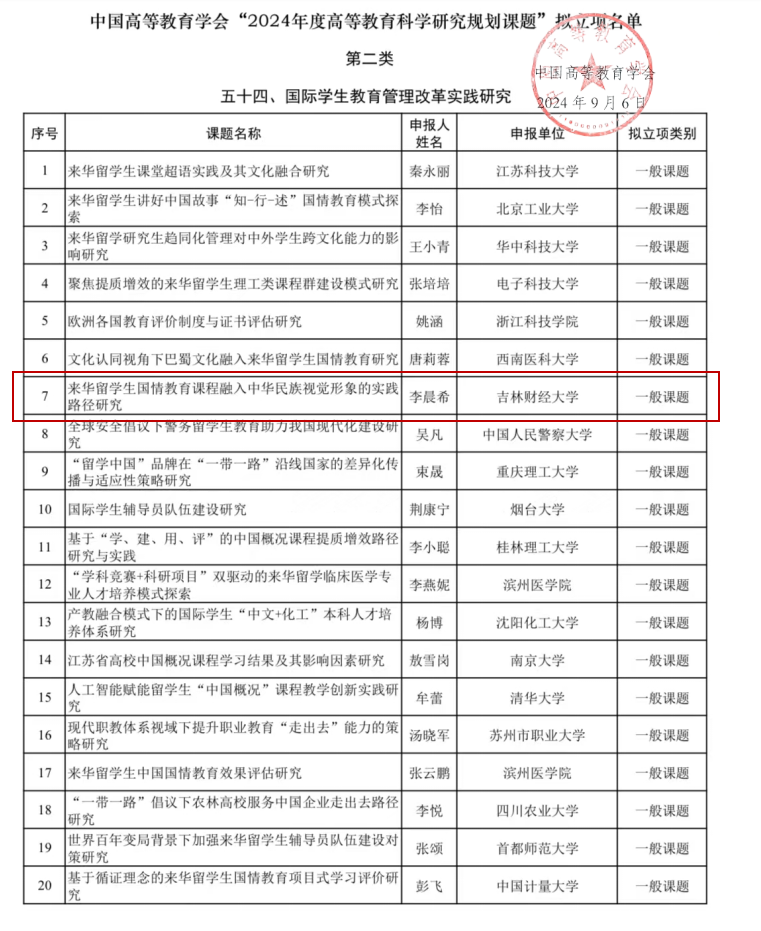 本网讯(公共外语教研部 供稿)近日,中国高等教育学会公布2024年度高等教育科学研究规划课题立项结果,taptap点点公共外语教研部李晨希老师主持的课题“来华留学生国情教育课程融入中华民族视觉形象的实践路径研究”成功获得批准立项。