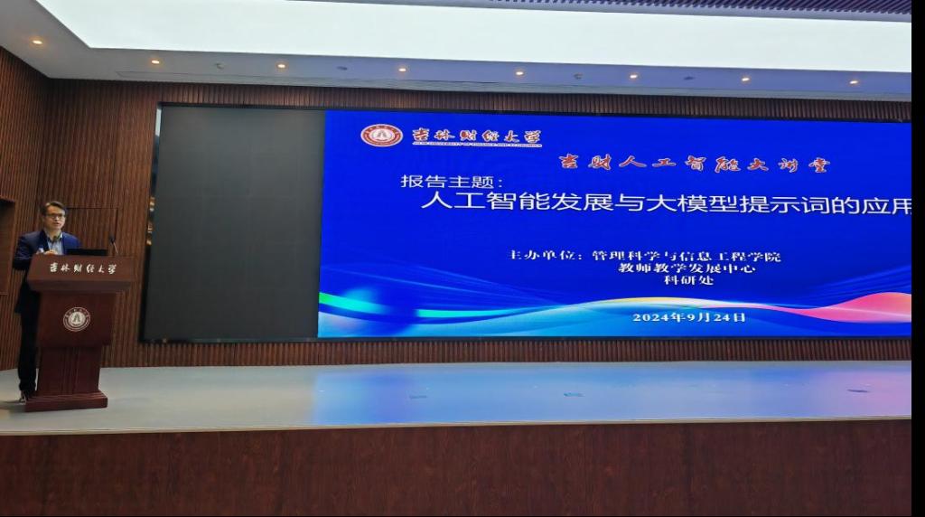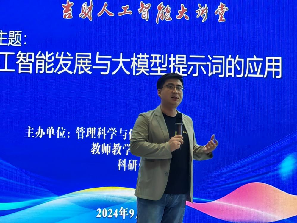 本网讯(管理科学与信息工程学院 供稿)智能引领未来,模型启迪智慧。9月24日,管理科学与信息工程学院、教师教学发展中心、科研处在新经济(数字经济)创新创业实训中心报告厅联合举办了《人工智能发展与大模型提示词的应用》主题报告会,邀请泽霖智能的创始人兼CEO王强作报告。此次报告会是“吉财人工智能大讲堂”系列活动之一。报告会由管理科学与信息工程学院院长姜建华主持。