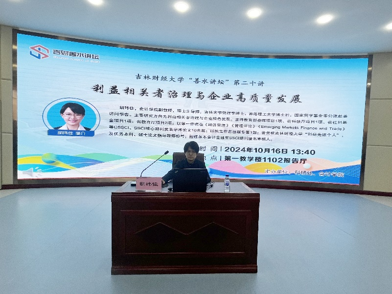 本网讯(科研处 供稿)为促进全校师生之间的学术交流,营造良好的学术氛围,10月16日下午在第一教学楼1102报告厅,会计学院副教授胡玮佳受邀为“吉财善水讲坛”作了题为“利益相关者治理与企业高质量发展”的学术讲座。