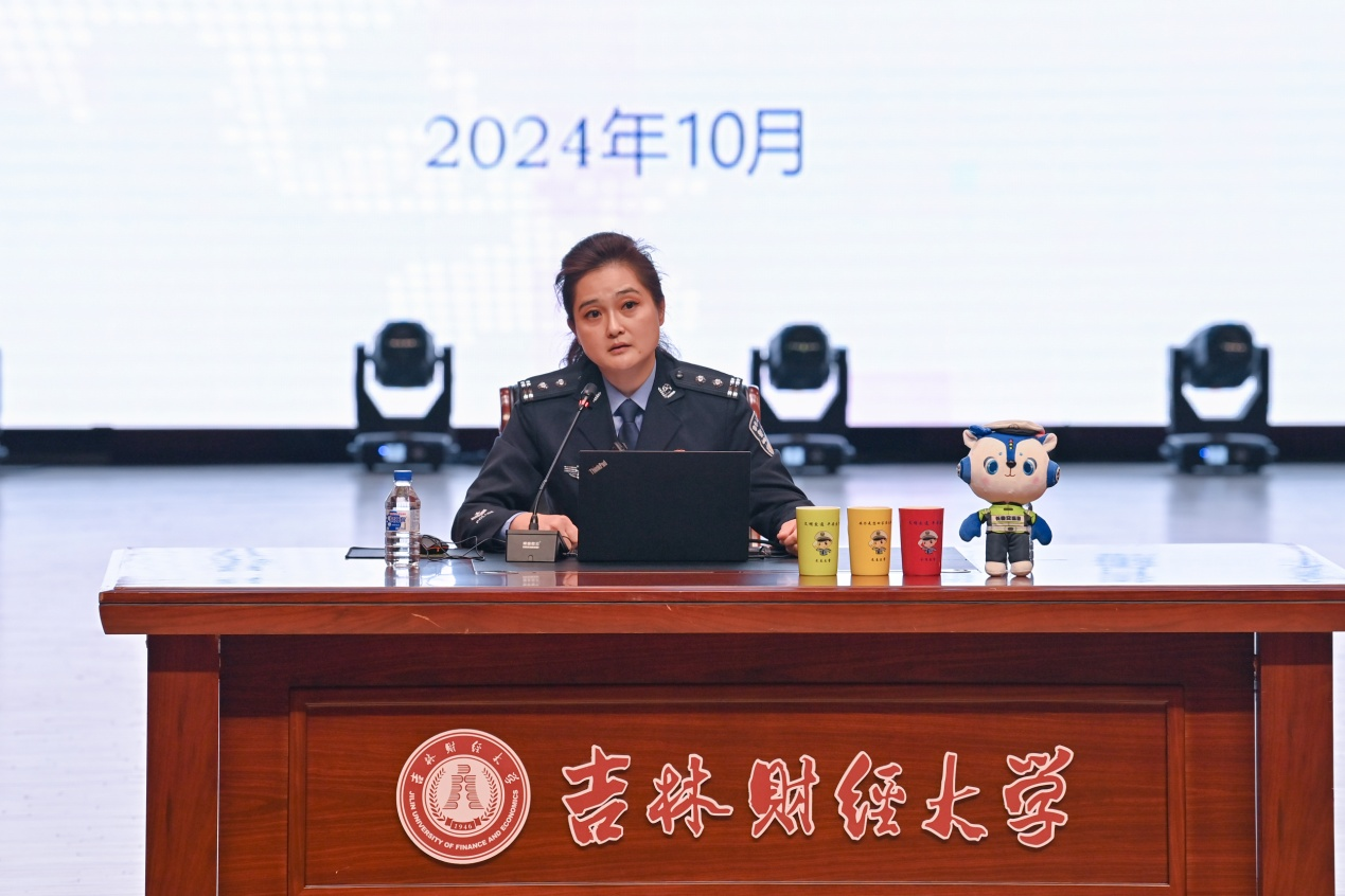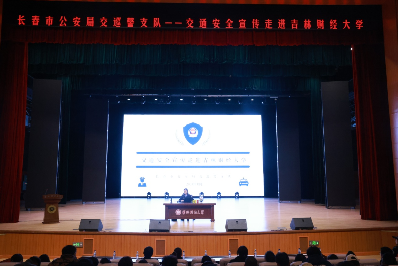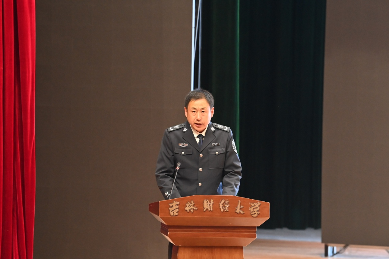 长春市公安局交巡警支队宣传处副处长邵云刚,交巡警支队交通安全宣讲团部分成员,安全保卫处全体人员,金融学院、工商学院、统计学院2024级新生同学参加了宣讲活动。安全保卫处处长桑学江主持宣讲活动。(审核人 桑学江)