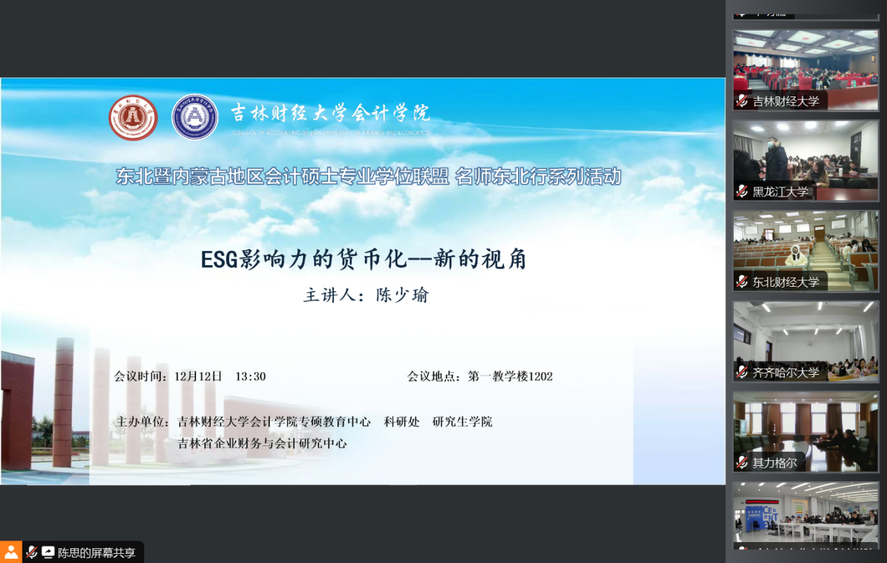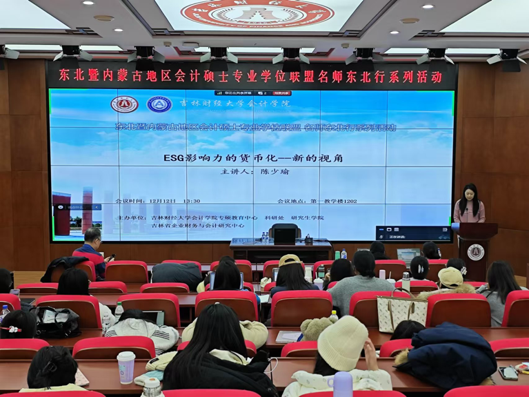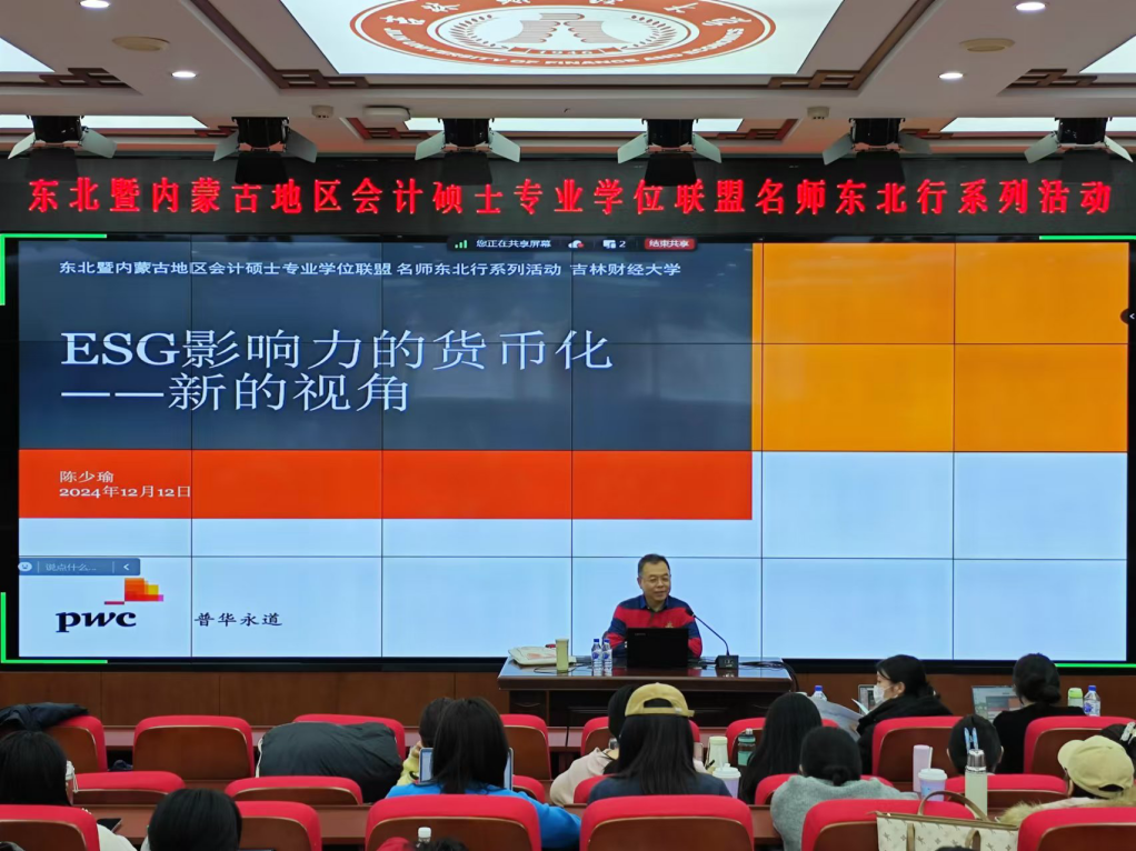 本网讯(会计学院 供稿)12月12日,taptap点点体育会计学院举办东北暨内蒙古地区会计硕士专业学位联盟“名师东北行”系列活动,邀请实务专家普华永道中国资深合伙人陈少瑜先生以“ESG影响力的货币化——新的视角”为题,为会计学院老师和研一会计专硕研究生做专题报告,报告由会计学院专业硕士教育中心主任邵方婧主持。