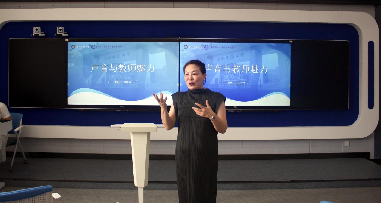 活动特邀东北师范大学传媒科学学院院长、博士生导师史册教授担任主讲,她从声音的专业理论知识讲起,深入剖析声音在教学中的重要作用以及如何通过声音提升教师魅力。史册采用灵活多样的互动式教学方法,从“内三”(内在语、情景再现、对象感)“外四”(停连、语气、重音、节奏)阐释教师如何进行科学发声、艺术用嗓。她鼓励教师们在课堂表现要“高于生活、低于舞台”,并结合自身丰富经验,运用多个教学案例,通过讲解与示范相结合的方式,介绍了戏剧教学法对于提升教师魅力的应用。