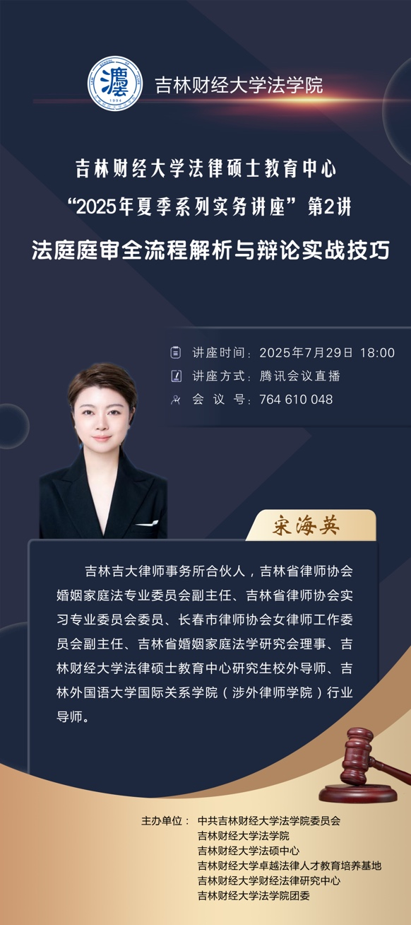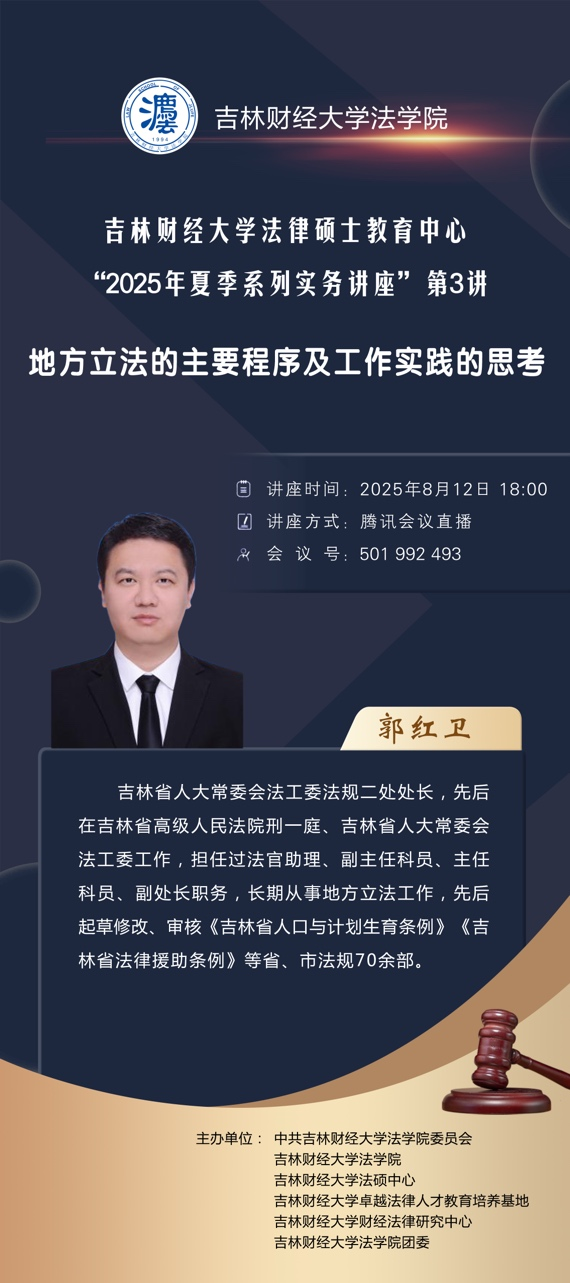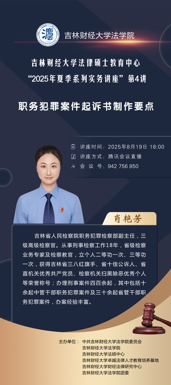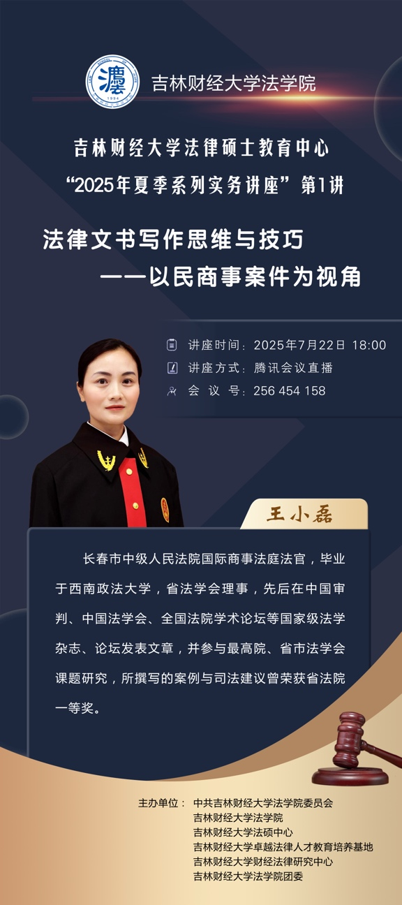 本网讯(法学院 供稿)7月22日至8月19日,taptap点点体育法律硕士教育中心“2025年夏季系列实务讲座”成功举办。本期讲座共四讲,分别邀请长春市中级人民法院国际商事法庭法官王小磊、吉林吉大律师事务所合伙人宋海英、吉林省人大常委会法工委法规二处处长郭红卫、吉林省人民检察院职务犯罪检察部副主任肖艳芳主讲,以“法律文书写作思维与技巧——以民商事案件为视角”“法庭庭审全流程解析与辩论实战技巧”“地方立法的主要程序及工作实践的思考”“职务犯罪案件起诉书制作要点”为题展开。法学院师生积极参与,讲座学术氛围浓厚。