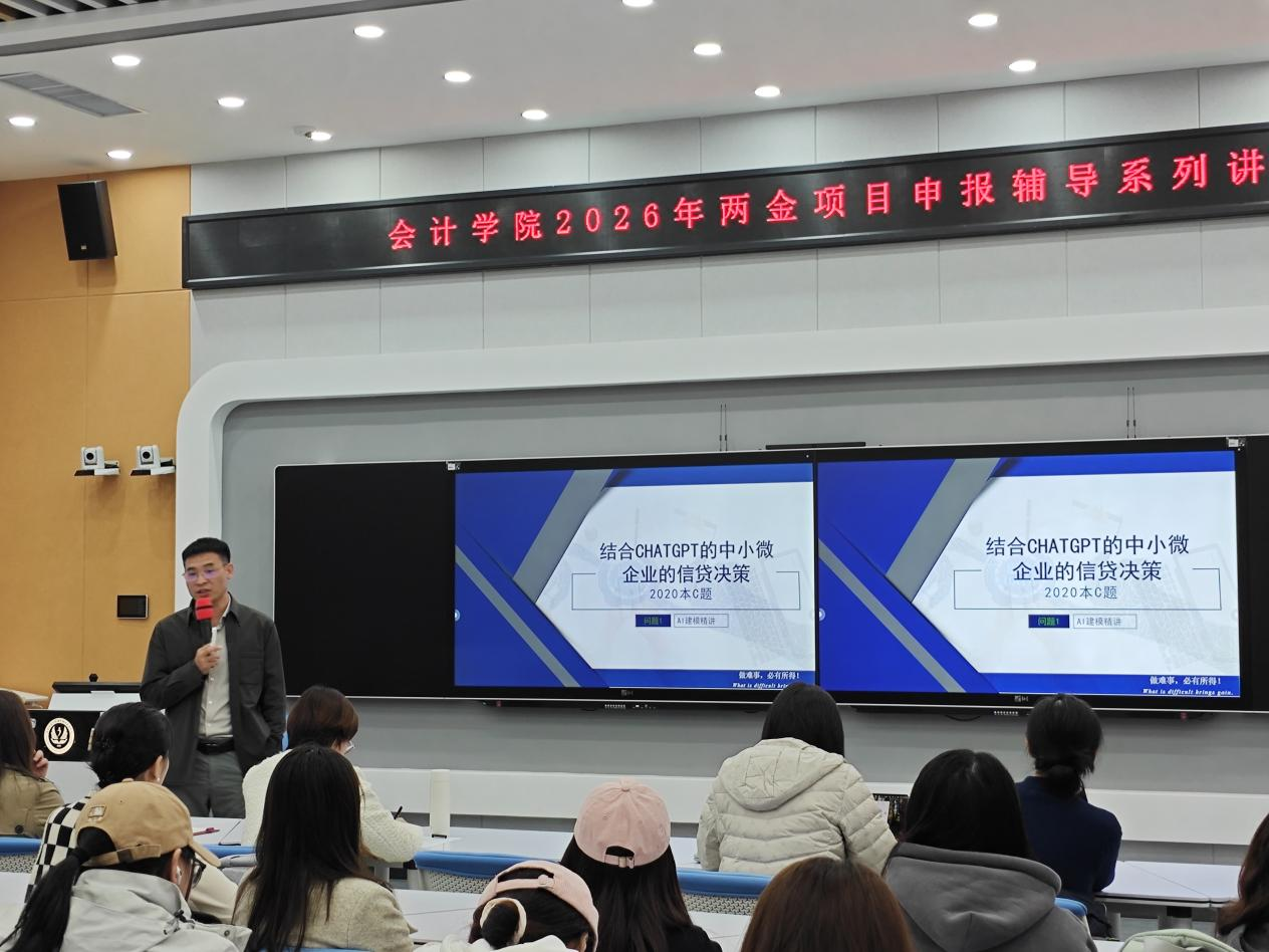 本网讯(会计学院 供稿)10月17日,会计学院启动“2026年两金项目申报辅导系列讲座”。首场讲座邀请大数据与交叉科学研究院院长木仁教授担任主讲嘉宾,从研究方法创新与工具应用角度,以“结合ChatGPT的中小微企业贷款策略研究”为主题进行分享。