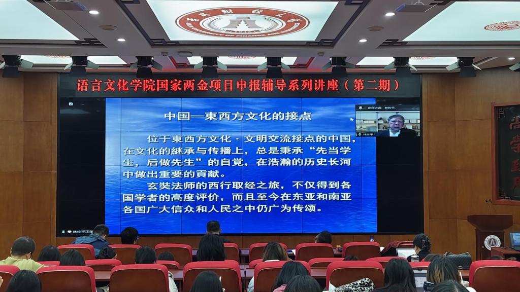 本网讯(语言文化学院 供稿)10月29日下午,语言文化学院国家“两金”项目申报系列辅导第二期讲座在1202会议室举行。讲座特邀教育部中国教育国际交流协会原常务理事、中日友好协会原理事林佐平教授,作题为《中国文化的海外传播——以国际人文交流为例》的专题分享。学院教师及2025级全体研究生参加。
