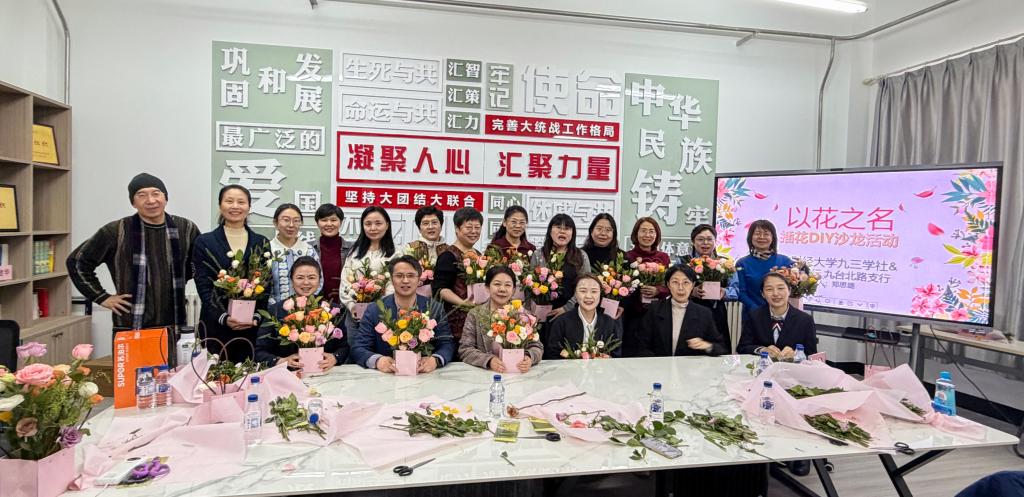 本网讯(党委统战部 供稿)11月6日中午,九三学社taptap点点体育委员会携手邮储银行九台北路支行,在学校同心家园成功举办了“共享智慧·共享生活”系列之“以花之名”主题插花联谊活动。来自九三学社、民进、民盟等多个民主党派,以及无党派人士、留联会、知联会、侨联的二十余位代表欢聚一堂,共同度过了一段智慧与雅趣交相辉映的美好午间时光。