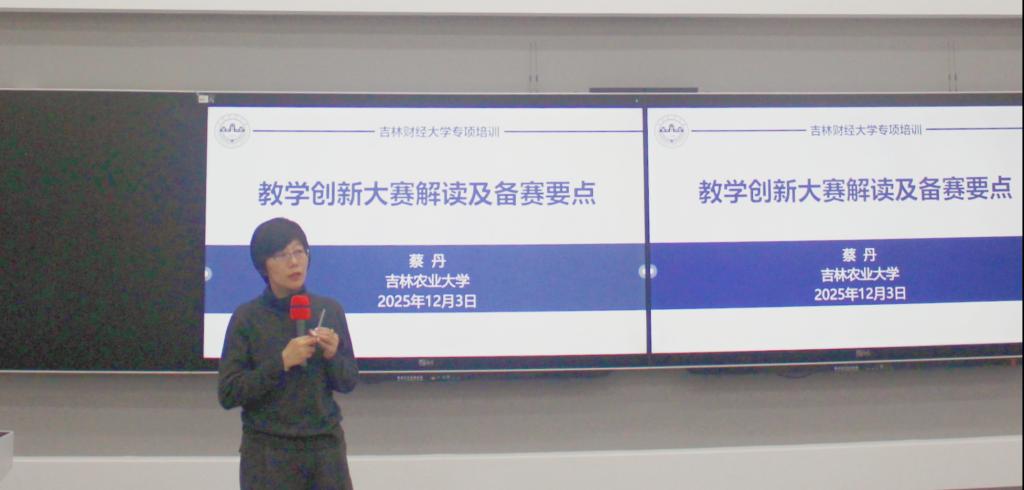 教育部教育教学专家、吉林农业大学教师教学发展中心副主任蔡丹教授作题为“教学创新大赛解读及备赛要点”的分享。她结合自身多次担任全国教学创新大赛评审的经验,从赛事规则、评审标准到教学设计逻辑等角度进行了全面而细致的解读。她强调,在教学设计与创新的过程中,应注重课程思政与专业教育的有机融合。