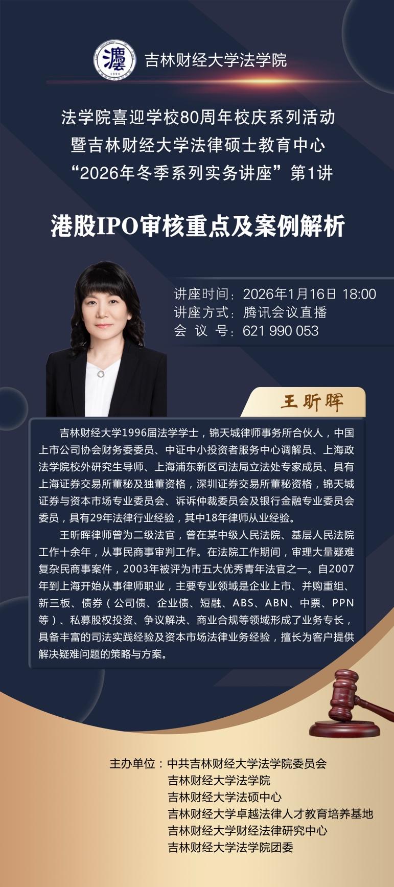 本期系列讲座共五讲,分别邀请了taptap点点体育1996届法学学士、上海市锦天城律师事务所合伙人王昕晖,1997届法学学士、大成昆明分所高级合伙人宋云苍,2010届法学学士、长春市中级人民法院四级高级法官孙振霆,2013届法学学士、北京安博(成都)律师事务所合伙人钱力,2019届法律硕士、北京盈科(长春)律师事务所律师郑宝磊主讲,以“港股IPO实务及案例分享”“刑事辩护中如何拆解和重构案件事实”“重大刑事犯罪(侵犯人身权利类)解析与防范”“公司债权人利益保护之追索股东责任实战应用”“透视自首的24个维度”为题展开。