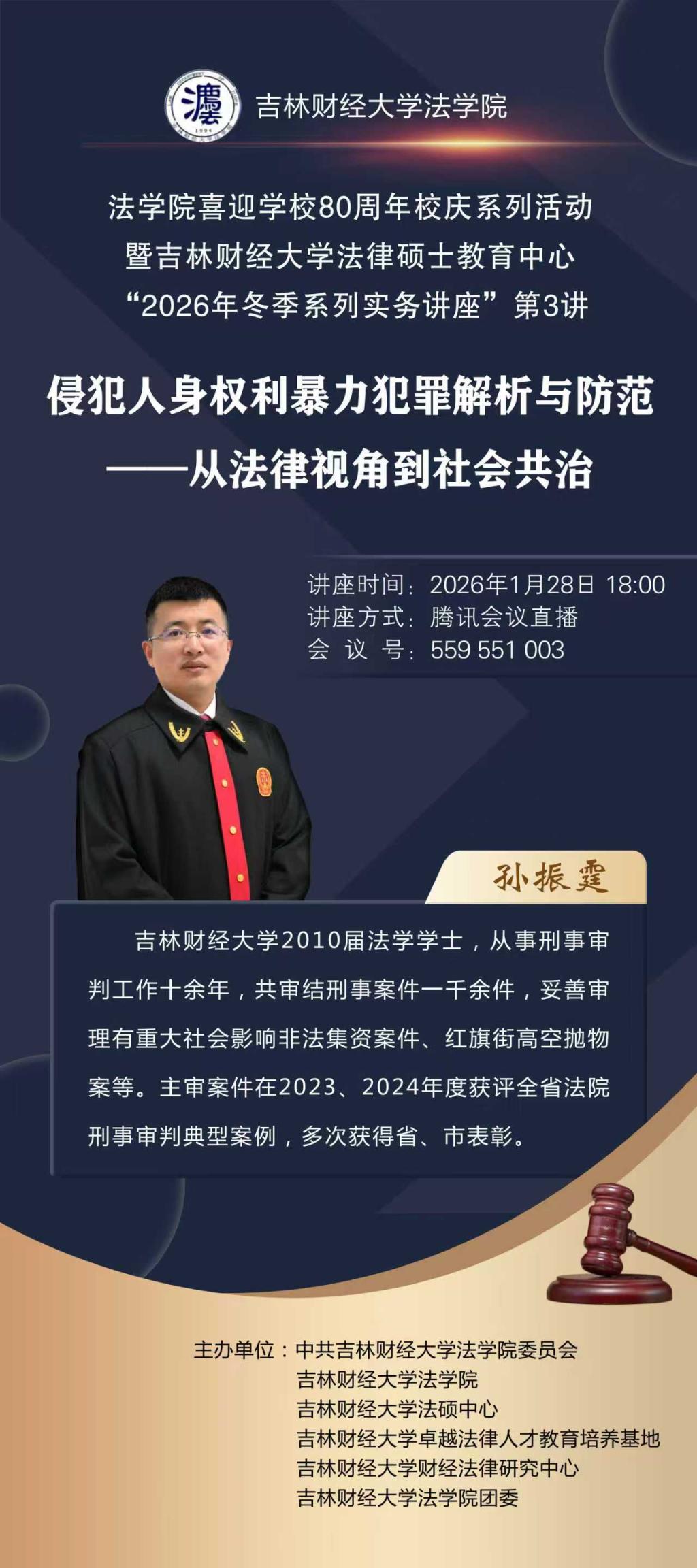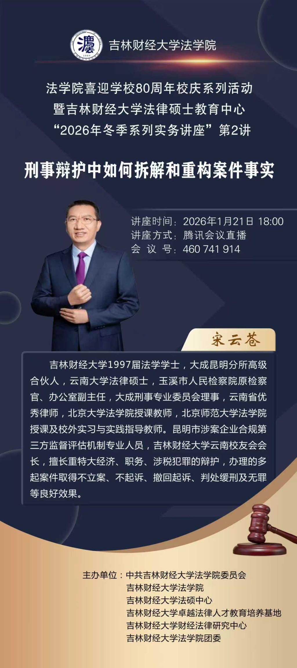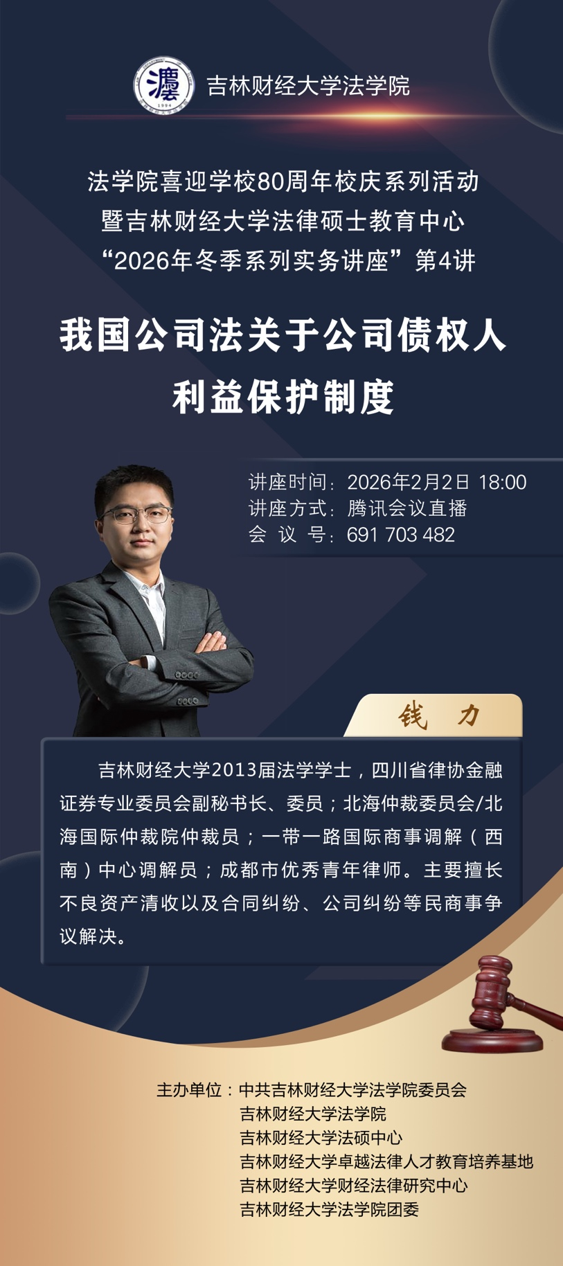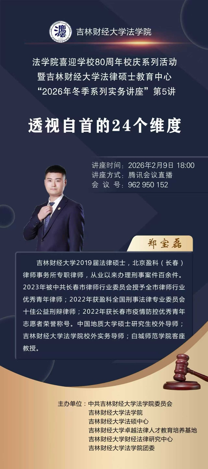 本期系列讲座以学校80周年校庆为契机,依托冬季系列实务讲座平台,深化法硕实务育人,凝聚师生校友合力,展示法学教育成果,同时为学院与学校发展注入品牌与资源动能,为学院打造一流法律硕士教育品牌注入持久动力。