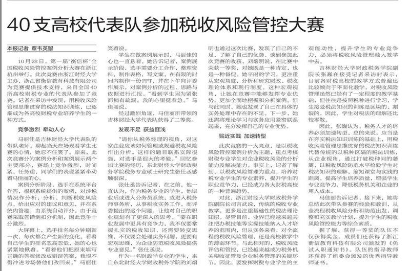 《中国税务报》非常关注此次赛事,就如何通过教学方法改革,用税收风险管理思维贯穿的税法知识训练,采访了税务学院副院长张巍教授和指导教师马丽佳老师,并对税务学院取得的成绩表示祝贺。税务学院将认真总结此次参赛的经验和教训,从全流程税务风险分析和防范出发,调整和充实教学计划,进一步提升学生的税务风险管理能力等综合素质。(审核人 田磐石)