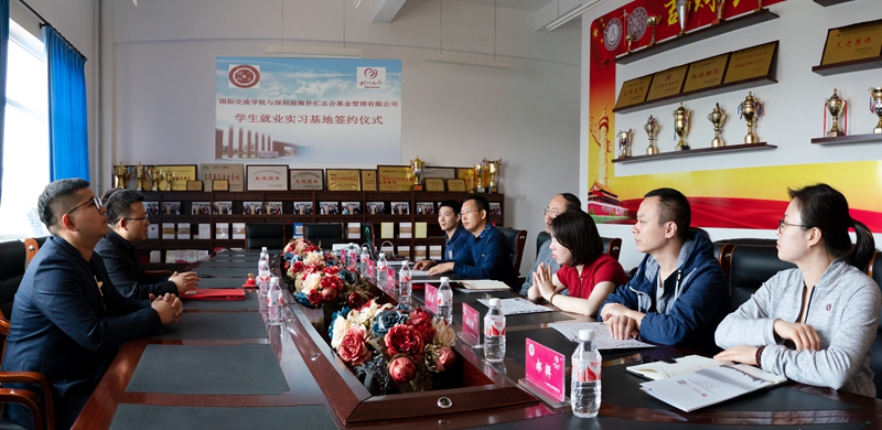 本网讯(国际交流学院 供稿)为进一步提高人才培养质量,强化实践教学环节,促进毕业生就业, 5月15日上午,国际交流学院在学院会议室与深圳前海朴汇志合基金管理有限公司共同签署了学生就业实习基地协议。国际交流学院院长张振华、学院党委书记马晓旭、学院党委副书记刘宇龙以及全体辅导员老师和部分学生代表共同参加了学生就业实习基地签约仪式。