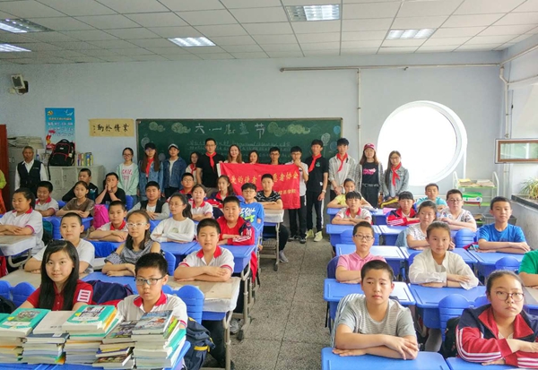 本网讯(国际经济贸易学院 供稿)“尊老爱幼”是中华民族的优秀传统。在“六一”国际儿童节来临之际,5月30日,国际经济贸易学院“爱的使者”志愿者协会组织11名党员、团员志愿者与中国好人刘健军敬老爱心志愿者联盟志愿者一起携手走进长春市明德小学,与该校六年级五班的同学们共同庆祝节日。