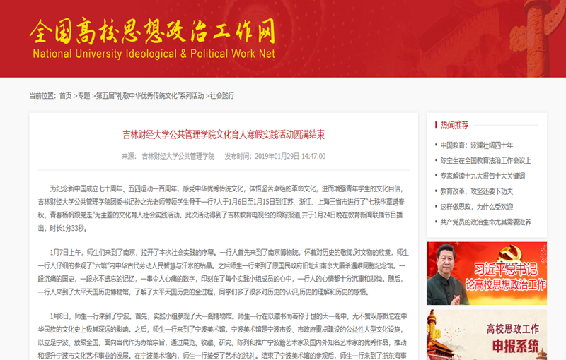本网讯(公共管理学院 供稿)为庆祝新中国成立七十周年、五四运动一百周年,感受中华优秀传统文化,体悟坚苦卓绝的革命文化,进而增强青年学生的文化自信,公共管理学院团委书记孙之光老师带领学生骨干一行7人于1月6日至1月15日到江苏、浙江、上海三省市进行了“七秩华章谱春秋,青春扬帆跟党走”为主题的文化育人暨五红教育社会实践活动。此次活动得到了吉林教育电视台的跟踪报道,并于1月24日晚在教育新闻联播节目播出,时长1分33秒。同时,2019年2月,教育部全国高校思想政治工作网图文展示了该活动,提升了学校文化育人的社会影响力,有效地带动“五红教育”的进一步优化开展。