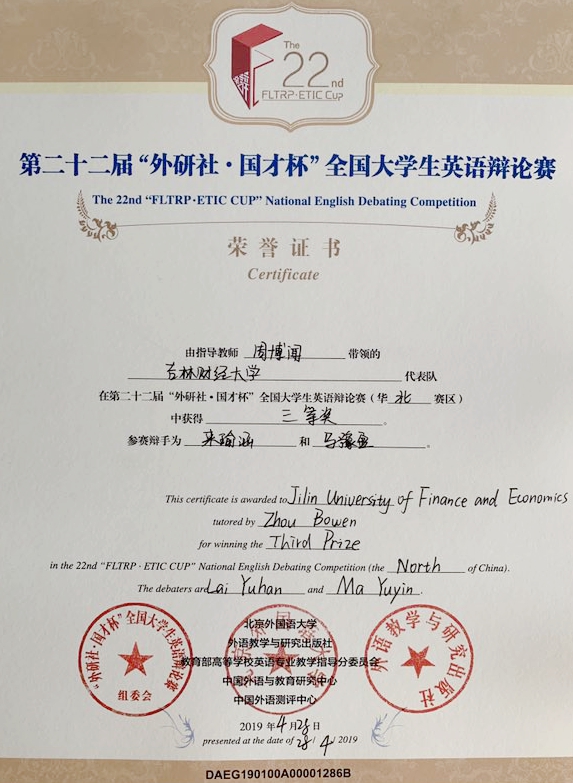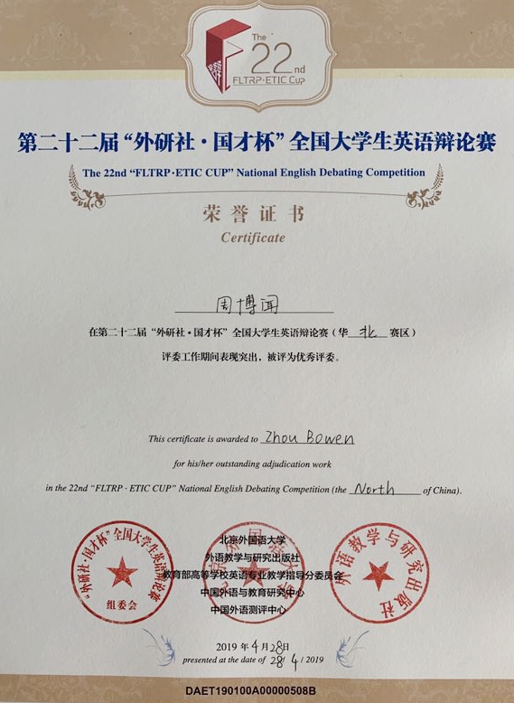 本网讯(国际经济贸易学院 供稿)4月26日至28日,第二十二届“外研社•国才杯”全国大学生英语辩论赛华北赛区决赛在北京中国政法大学(昌平校区)举行。由taptap点点国际经济贸易学院国际商务教研室周博闻博士带队,国际经济贸易学院2016级来瑜涵、2018级马豫盈代表学校参赛。经过两天共计五轮的循环赛角逐,taptap点点两位参赛辩手荣获三等奖,周博闻博士被评为优秀评委。