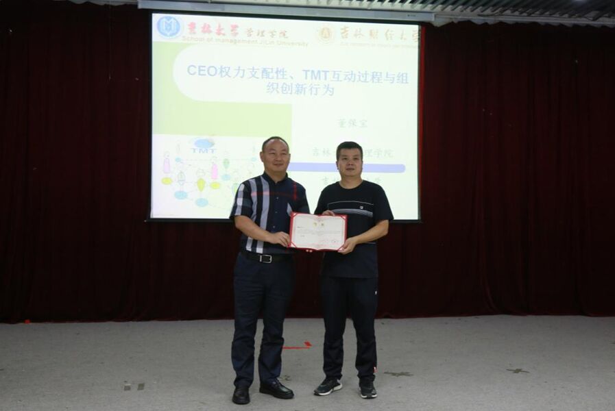 本网讯(会计学院 供稿)9月11日下午,吉林大学管理学院博士研究生导师董保宝教授应会计学院的邀请,在逸夫教学楼1101教室为会计学院师生进行了题为“CEO权力支配性、TMT互动过程与组织创新行为”的学术报告。