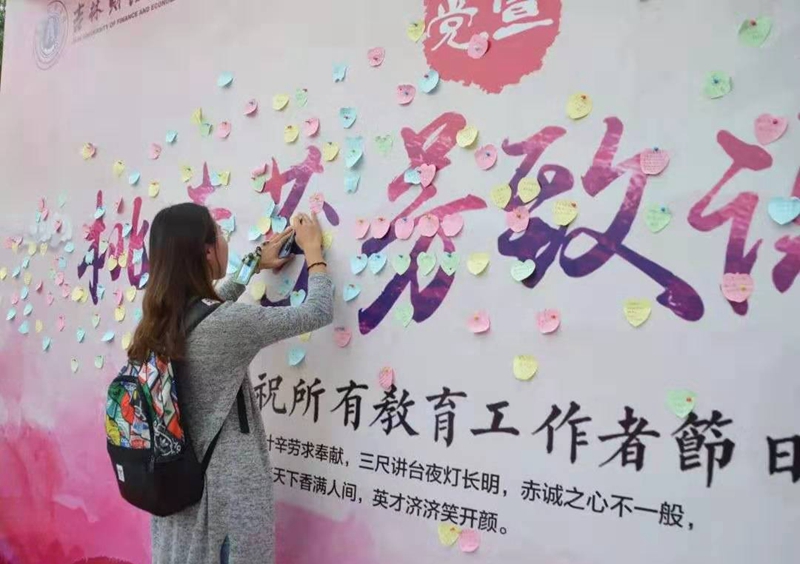 本网讯 9月10日是我国第35个教师节,为做好2019年教师节庆祝工作,集中展示学校深入学习贯彻习近平新时代中国特色社会主义思想、全面贯彻落实全国和全省教育大会精神成效,展现广大教师爱国奋斗、立德树人的精神风貌,弘扬尊师重教的社会风尚,激励广大教职工不忘初心、牢记使命,建设高水平财经大学。今年教师节期间,党委宣传部、校团委举办了多项活动,喜迎第35个教师节。