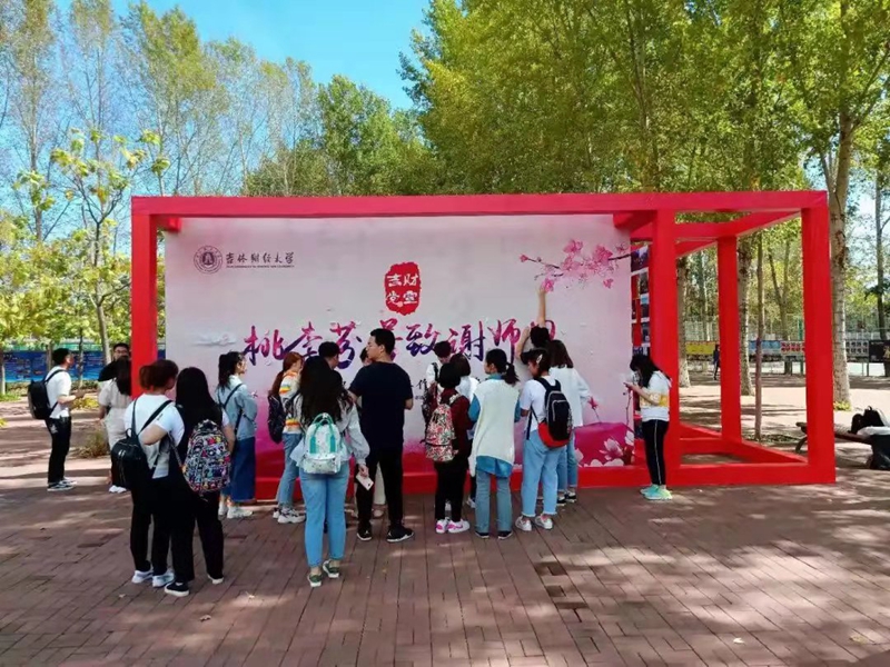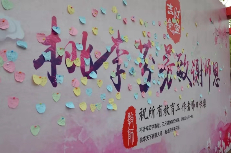 9月7日,学校二食堂前的长税广场上布展了别具一格的教师节展架和展板。展板正面“桃李芬芳致谢恩师——祝所有教育工作者节日快乐”的祝福语格外醒目,体现着学校对广大教职工的殷殷祝福和衷心感谢。展板背面设置为签名祝福的地方,全校学生在这里或通过书写祝福语、或粘贴感恩小便签,表达对培养自己的恩师的感激和祝福之情。以教师节为主题的展架上,错落有致地摆放着不同学院学生学习生活的照片,近100张照片摆成“师恩”两个字,展现了taptap点点学生对老师的尊重和感恩之情。从9月7日至12日,路过长税广场的学生纷纷来到展板前,或者驻足观看,或书写祝福,在这个教师节留下了他们的感恩与祝福。