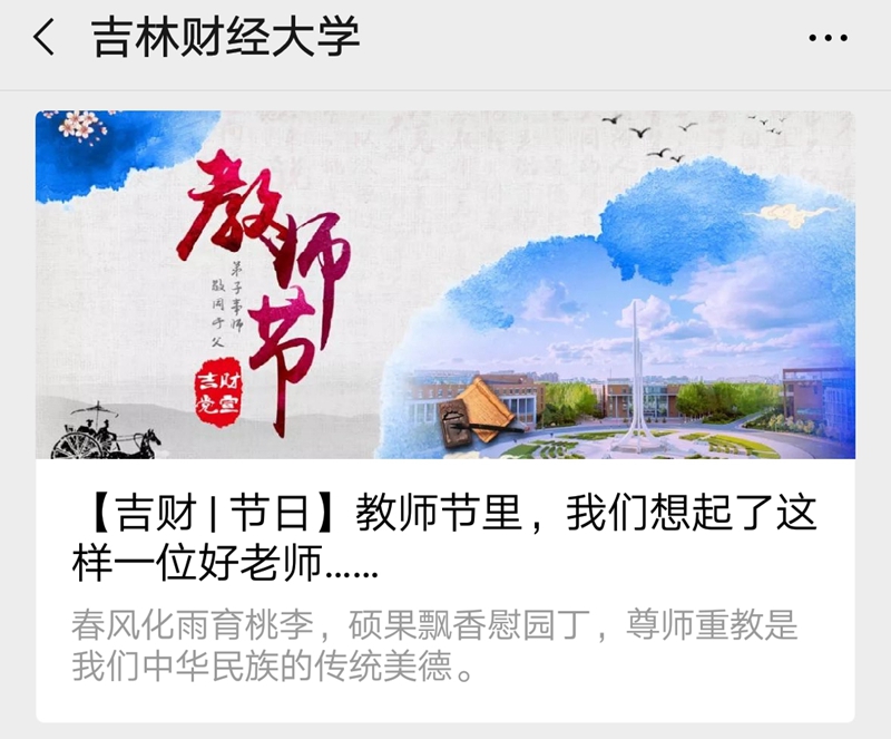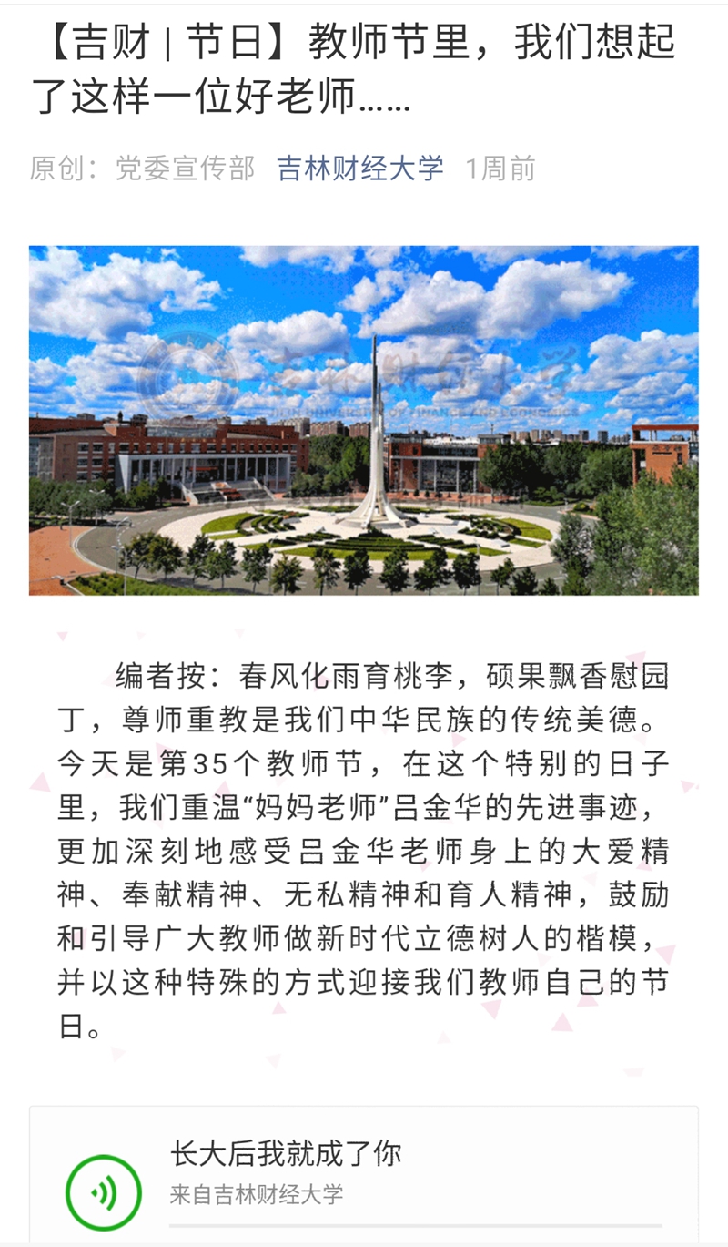 春风化雨育桃李,硕果飘香慰园丁,为进一步加强师德师风建设,鼓励和引导广大教师做新时代立德树人的楷模,9月10日,学校官微以《教师节里,我们想起了这样一位好老师》为标题,推出了“妈妈老师”吕金华的感染事迹,重新感受吕金华老师身上的大爱精神、奉献精神、无私精神和育人精神,微信推出后,获得了广泛好评。通过重温吕金华老师的感人事迹,对全校教师更加深入地学习贯彻习近平总书记在全国思想政治工作会议、全国教育大会和学校思想政治理论课座谈会上的讲话精神,进一步加强师风师德建设,遵守《新时代高校教师职业行为十项准则》具有重要的意义,从而鼓励和引导广大教师做有理想信念、有道德情操、有扎实学识、有仁爱之心的好老师,做学生锤炼品格的引路人、学习知识的引路人、创新思维的引路人、奉献祖国的引路人。
