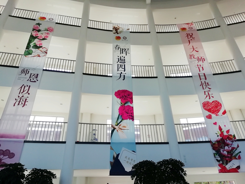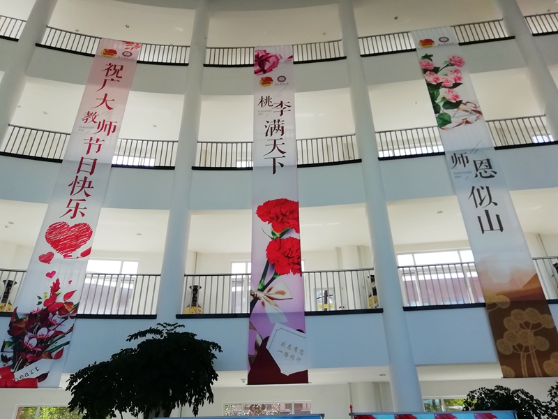 而在综合楼大厅,5条设计典雅庄重、与众不同、富有特色的教师节祝福条幅悬挂在大厅,“祝广大教师节日快乐”“桃李满天下”“师恩似山”“师恩似海”“春晖遍四方”5条教师节的条幅用清新喜庆的背景、温馨感人祝福、师恩难忘话语,表达着对全校教职工辛苦工作和努力付出的肯定和赞誉,让全校教职工感受到节日的快乐和祝福。