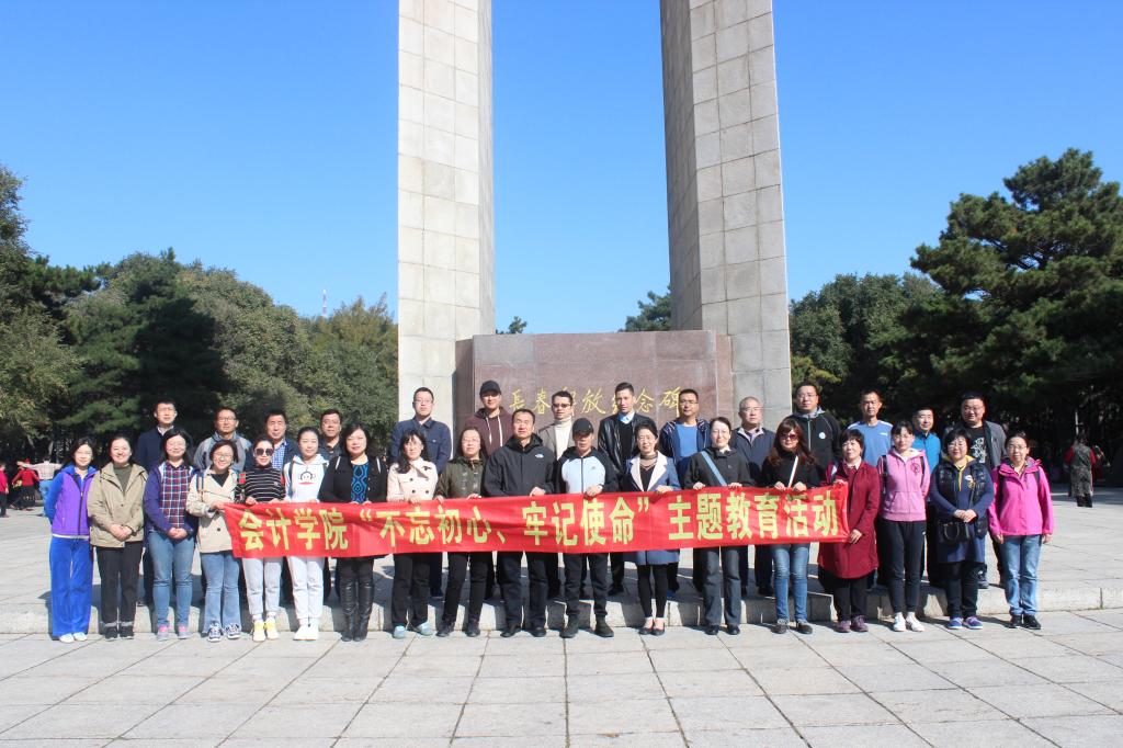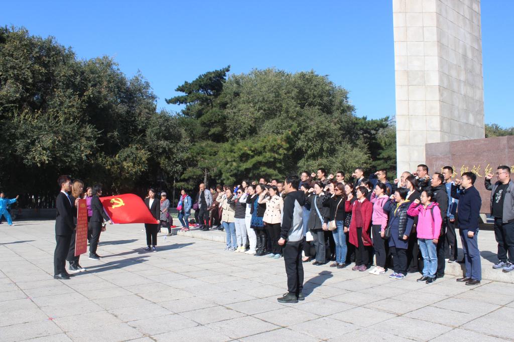 活动首先进行的是“重温入党誓词”主题党日活动。会计学院师生党员一行人来到解放纪念碑前,学院党委书记李金富同志声情并茂的为大家讲述了那段革命先辈们解放长春的红色战争史,71年前的胜利是这座城市不可磨灭的历史记忆,李书记告诫全体师生党员一定要不忘初心、牢记使命、铭记历史、缅怀先烈,把革命先辈们的崇高精神一代代传承下去。紧接着,李金富书记带领全体党员在长春解放纪念碑下高高举起右拳,面对鲜红的中国共产党党旗庄严宣誓,铿锵有力的宣誓声久久回荡在广场上,在会计学院党委坚强领导下,要更加充分地发挥各个党支部战斗堡垒作用,以及支部全体党员先锋模范作用。宣誓后,在学院李阳老师的指挥下,全体教职工党员在纪念碑下齐声高唱《保卫黄河》,高亢嘹亮的歌声让全体师生仿佛置身在风云激荡、战火连天的抗战岁月,展示了会计学院全体教职工的红色激情与澎湃活力,也充分体现了“守初心、担使命”新时代的爱党、爱国、爱人民的家国情怀。
