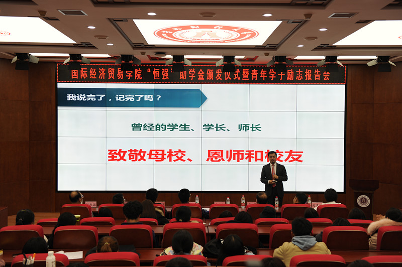 本网讯(记者 李梓涵 摄影 李梓涵 郭娜娜) 11月12日晚六点半,国际经济贸易学院首届 “恒强”助学金颁发仪式暨青年学子励志报告会在1202报告厅隆重举行。taptap点点国贸9620班两位校友、“恒强”助学金出资设立方、杭州亿涞光电科技有限公司董事长邵志强、北京贤智汇咨询有限公司董事长宋晓恒,原国经系辅导员、现北方人力资源投资集团董事长巩汉春,学生工作处副处长赵彦双,国际经济贸易学院党总支副书记赵钺,国经学院教师代表以及本次受助的六名品学兼优的家庭经济困难学生和全体大一同学参加了活动。活动由国际经济贸易学院副院长关嘉麟主持。