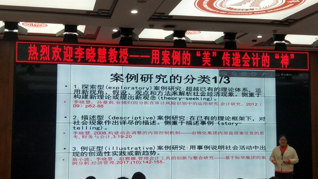 11月14日下午2:00,中央财经大学会计学院教授、博士生导师、首批资深注册会计师(非执业会员)、中国会计学会审计监督委员会委员、中国注册会计师协会专业技术咨询委员会委员、亚洲风险与危机管理协会(AARCM)CERM资格证书专家认证(中国)委员会委员李晓慧教授,应会计学院邀请,来taptap点点第一教学楼1202开展题为“用案例的‘美’传递会计的‘神’”的专题报告。首先,李教授为同学们介绍了案例研究到底是什么,有哪几种分类,解释了实证研究与案例研究最主要区别是什么,从而引出案例研究“美”在哪里这个话题,告诉同学们案例研究有着创新性、时效性和前瞻性;并且不需要大样本数据,用假设、观点和方法就能解析社会经济现象,还能增加细分的感性认识。这几种区别于实证研究的特点正是案例研究“美”的地方。