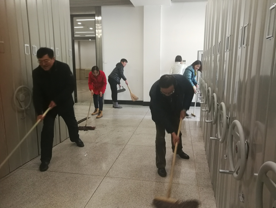 上午,图书馆教工二支部组织党员自带清扫工具,来到密集书库的责任区域开始义务劳动。党员们有的擦桌子,有的擦暖气片,有的扫地,有的拖地,有的倒垃圾,虽然脸上已经有了汗珠,但大家的情绪饱满,在劳动中感受到快乐。