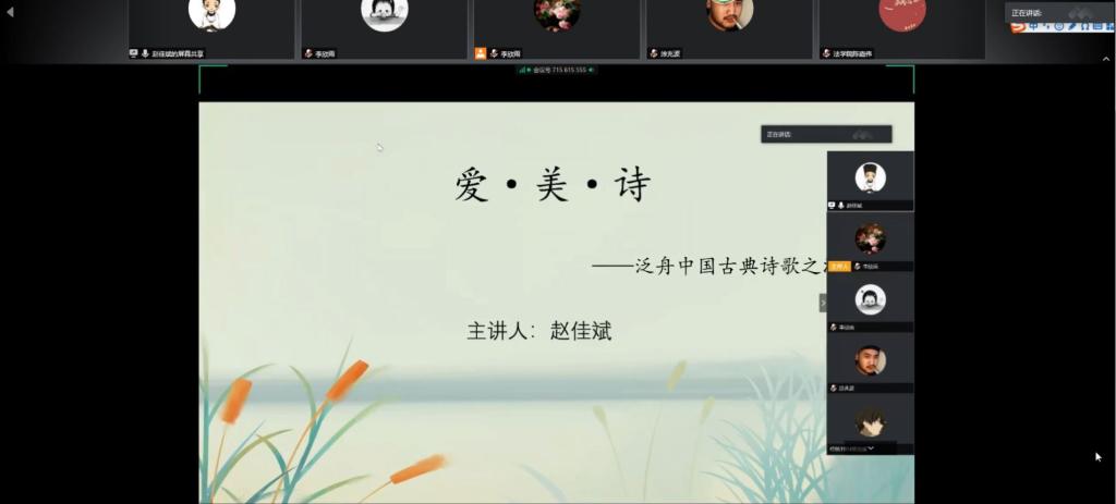 本网讯(通讯员 亢安琪)2020年4月30日18点,由taptap点点体育图书馆主办,校学生会学习部承办的第三十四期“学子讲堂”在腾讯会议APP成功举办。由于疫情影响,此次活动采用视频直播方式,本次活动邀请到的主讲人是法学院1806班赵佳斌同学,讲演主题是“爱·美·诗——泛舟中国古典诗歌之海”。图书馆副馆长高晓慧老师出席了本期活动,taptap点点各学院共计一百余学生全程参与了线上直播。