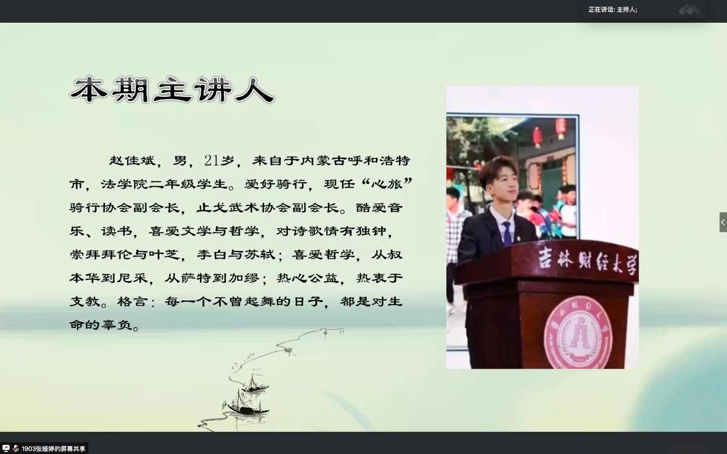 主讲人赵佳斌同学在前话中简单概述了爱情与古典诗歌的千年奇缘,带领大家走进美轮美奂的古典诗歌世界。并以前秦诗歌《诗经·国风·郑风·野有蔓草》为媒,从四个层面对中国古典诗歌进行了剖析:一、从诗歌的结构、音韵品读诗歌的外在之美。诗与歌本来同宗同源,从 “重章复沓”的手法运用,到斟酌选取韵脚,再到连绵词的使用,使诗歌更加灵动,行云流水而又音韵和谐,简单又深婉的格律之美让观众也仿佛醍醐灌顶,为之击节。二、从内容、手法探寻诗歌内在之美,首句“野有蔓草”运用“兴而比之”,一四句、二五句和三六句采用重章复沓,以及留白和隐喻的艺术手法,将爱情的朦胧意境之美传递给读者。三、对于诗歌中美好爱情的深层追问,赵佳斌借《野有蔓草》这首诗中男女主人公的邂逅与相爱,揭示出诗歌另一个维度的美:在哲学高度给人的心灵以启迪。四、总结并引申如何进行诗歌鉴赏。诗是诗人真情实感的映射,诗歌凝练并传达的是人生智慧,希望大家可以以对美的向往作为指引,从《诗经》这个源头出发,以爱情这个重要题材作桨,以一颗喜爱诗歌,热爱生活,关爱生命的心为舵,泛舟于中国古典诗歌的海洋!最后,赵佳斌同学表示,他对诗歌的理解得益于王国维的《人间词话》,首推给大家,同时向大家推荐《诗经·国风》《高唐赋》《文赋》《古诗十九首》等诗,冀望大家能借此初窥门径,更加了解并爱上诗歌。