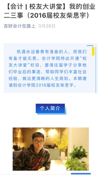 此项活动得到了校友的大力支持,78级校友崔少华和88级校友何俊岩分别为活动撰写了寄语。历届优秀校友纷纷撰文向同学们分享就业经历;安徽大学博导05届校友周泽将教授《使劲的努力,平静的接受》;吉林省中行金融部主任10届校友曲东魁《繁花盛,再一程》;中车长春轨道客车股份财务部14届校友韩东《珍惜当下,把握未来》;吉林大学财务处15届校友孙村惠子《在选择中提升格局,在感恩中砥砺奋斗》;华为公司原长春市十佳大学生16届校友李金鹏《春风得意马蹄疾,我辈岂是蓬蒿人》;北京悦读文化传播有限公司创始人16届毕业生柴思宇《我的创业二三事》;华为技术有限公司19届优秀校友李才寓《竹杖芒鞋轻胜马,谁怕?一蓑烟雨任平生》;中国石油天然气集团审计服务中心的16届校友解宏升《求职心得经验分享》;中化集团中国金茂控股集团有限公司17届校友于涵《成长分享与职业规划建议》共10名优秀校友为毕业生就业进行了云指导。