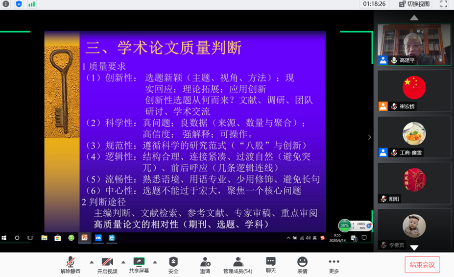 本网讯(亚泰工商管理学院 供稿)6月14日上午,亚泰工商管理学院邀请科技进步与对策杂志社副主编高建平研究员为师生作关于“如何写好高质量学术论文”的线上学术讲座。本次讲座由亚泰工商管理学院副院长崔宏桥主持,学院专任教师和研究生参加了讲座。
