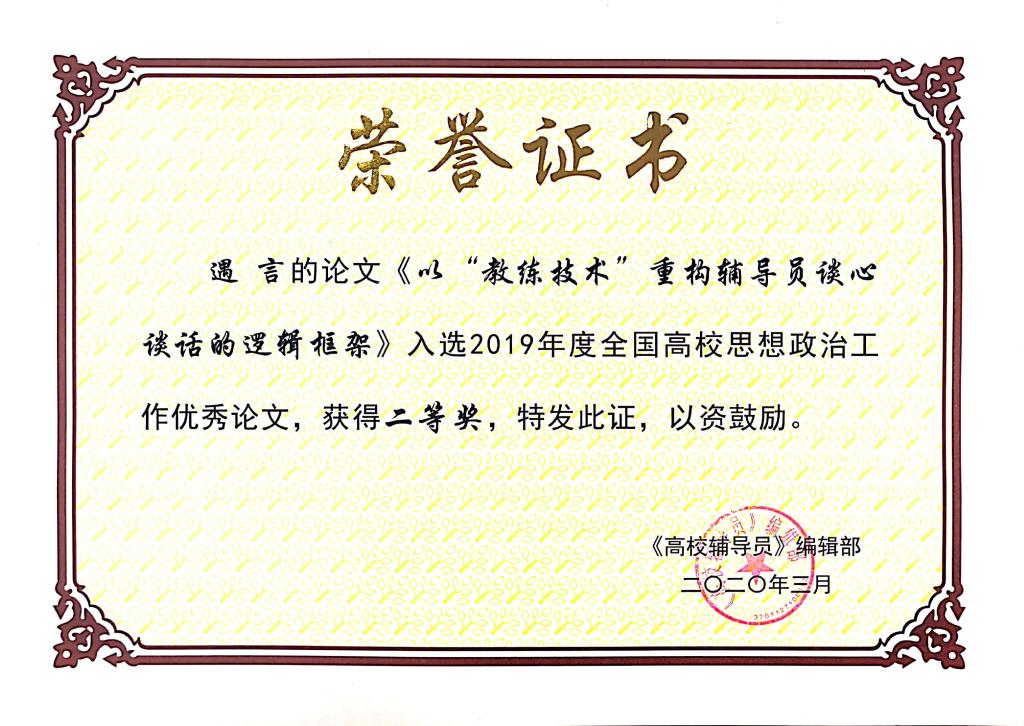 本网讯(学工处 供稿)近日,《高校辅导员》杂志社公布了2019年度全国高校思想政治工作优秀论文征集结果,taptap点点国际经济贸易学院团委书记遇言撰写的《以“教练技术”重构辅导员谈心谈话逻辑框架》荣获二等奖。