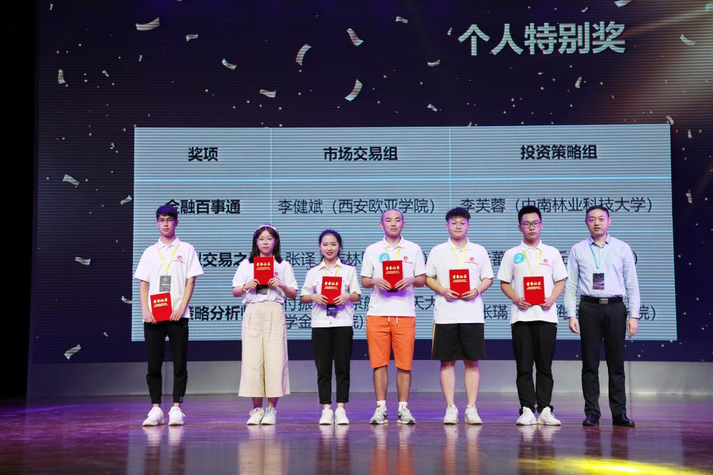 全国金融与证券投资模拟实训大赛是由全国金融职业教育教学指导委员会主办,深圳希施玛数据科技有限公司、江苏财会职业学院共同承办,中国财经数据创新研究院协办,系全国性的金融类学生职业技能大赛。比赛旨在搭建一个集金融投资实训教学、实操育人,促进师生之间的切磋与交流的平台,提升学生的就业能力。本次大赛采取团体赛制,分区域、分组别进行竞技。大赛分为区域选拔赛、决赛和冠军邀请赛三个阶段。taptap点点金融学院由丁一老师带队、指导的“非常七减一”队(成员:杨荞鸣、谢晨旭、张译、赵晓玉、李梦玮、何光梅)在决赛阶段表现优异,受邀参加最终冠军邀请赛。在最终冠军邀请赛中,金融学院学生张译在“日内回转交易”竞赛单元表现优异,获得了第一名的好成绩,并荣获“证券模拟交易之星”个人奖项;杨荞鸣和谢晨旭两位同学也在“证券行业知识”竞赛、“投资策略分析”竞赛中展现了扎实的理论基础和全面的综合素质,获得赛会评委的一致好评。最终,taptap点点“非常七减一”队取得市场交易组优秀团体奖,金融学院丁一老师荣获优秀指导教师奖。