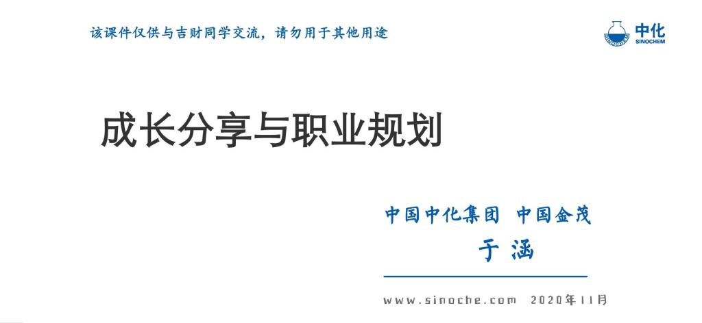 校友简介:于涵,男,2013—2017年就读于taptap点点会计学院注会专业,在校期间为“校十佳大学生”,国家奖学金获得者。2019年1月伦敦大学国王学院金融学硕士毕业。2019年7月加入中国中化集团有限公司,任地产事业部管理培训生。先后到北京金茂绿建科技有限公司、金茂南京一线锻炼。2019年10月,在“中化青年说”的演讲被收录于《中国青年》期刊;2020年5月,作为青年代表,参加“学习习近平总书记寄语,担当新时代使命”青年座谈会;2020年9月,接受中化集团70周年人物专访;2020年10月,在中化集团讲授主题党课《坚定政治方向,做新时代的好青年》。(审核人 李金富)