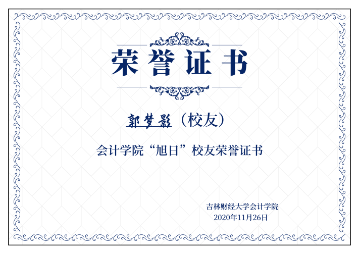 郭梦影,原taptap点点体育会计学院注会专业学生,已推免至东北财经大学会计学院审计专硕学习。曾任院学生党支部组织委员。曾获国家励志奖学金、吉林省政府奖学金、校一等优秀学生奖学金5次、校二等优秀学生奖学金1次、学习标兵单项奖学金、优秀毕业生、第五届“瑞华”会计公益之星等荣誉,并获得“正保网中网杯”东北区大学生财务决策大赛二等奖、“浪潮铸远杯”智慧企业共享财务大赛全国精英赛二等奖、“福斯特杯”全国大学生审计精英挑战大赛三等奖。