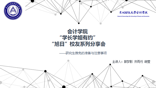 本网讯(会计学院 供稿)会计学院为了进一步落实立德树人的根本办学宗旨,激励会计学子刻苦学习、努力探索、积极进取、全面发展,决定举办“学长学姐有约”“旭日”校友系列分享会。为帮助同学们全面了解研究生推免流程、明确学习目标、做好个人规划,会计学院于11月26日晚19:00在线上举办了主题为“研究生推免的准备与注意事项”校友分享会。会计学院副院长王丽南、团委书记王萌以及学院190余名同学参加了本次活动。本期活动邀请到注会2020届毕业生现就读于东北财经大学研究生郭梦影以及现大四在校生齐雨竹、胡莹三位同学作为主讲人。