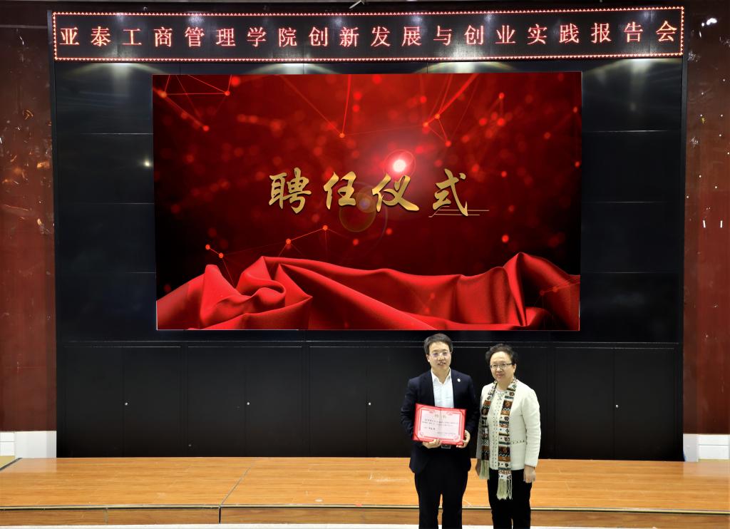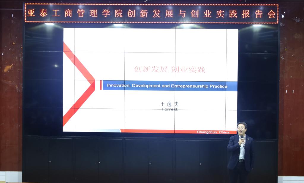 本院讯(亚泰工商管理学院 供稿)为响应“大众创业,万众创新”的时代号召,进一步提升大学生创新创业技能,亚泰工商管理学院于2020年12月2日下午15:10邀请王逸夫先生为学院全体学生开展“创新发展与创业实践”报告会。亚泰工商管理学院院长郑美群、工商管理系主任霍晓艳、学生工作办公室全体老师及各个年级学生代表参加本次报告会,报告会由李元元老师主持。
