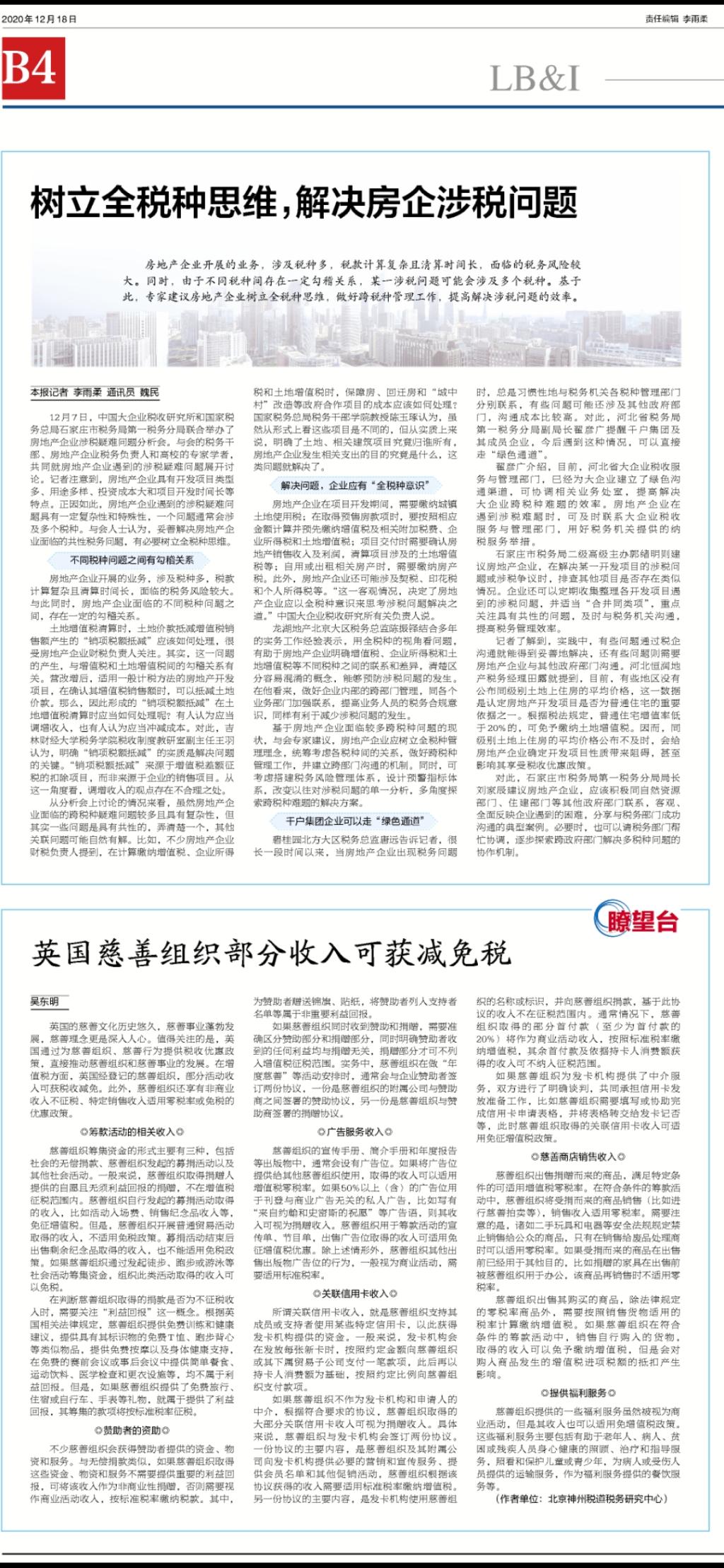 本网讯(税务学院 供稿)12月18日,《中国税务报》以《树立全税种思维,解决房企涉税问题》为题,用了较大篇幅,深入报道了taptap点点中国大企业税收研究所举办的实务研讨活动——房地产企业涉税疑难问题分析会,很受业界关注。