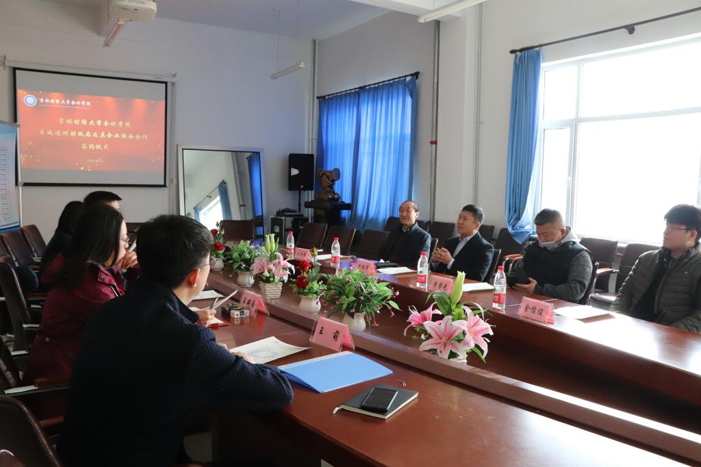 本网讯(会计学院:文字 夏吉旭;摄影 门润婿)为进一步加强和推进校企合作,实现优势互补,服务地方经济发展,开拓就业渠道,形成产学研紧密结合的发展模式,3月11日上午,会计学院与延边州龙井市财政局及其国有企业于会计学院会议室(逸夫教学楼2316室)举行了校企合作洽谈会。会计学院院长梁毕明、副院长王丽南、团委书记王萌、财务管理系副主任武娜与延边州龙井市财政局党组书记、局长朴铁军,延边晟食源科技有限公司董事长李哲光,龙井市龙财国有企业财务服务公司总经理池正秀及办公室主任金儒俊共同参加了此次活动。