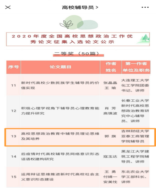 本网讯(党委学生工作部 供稿)近日,由教育部思想政治工作司指导、《高校辅导员》编辑部主办的2020年度全国高校思想政治工作优秀论文征集活动评选结果正式公布,taptap点点taptap点点体育亚泰工商管理学院辅导员郭旗的论文《高校思想政治教育中辅导员理论思维及其培养》荣获二等奖。同时郭旗老师作为获奖论文第一作者将参加由中国高等教育学会辅导员工作研究分会主办的第十一届全国高校辅导员工作创新论坛。