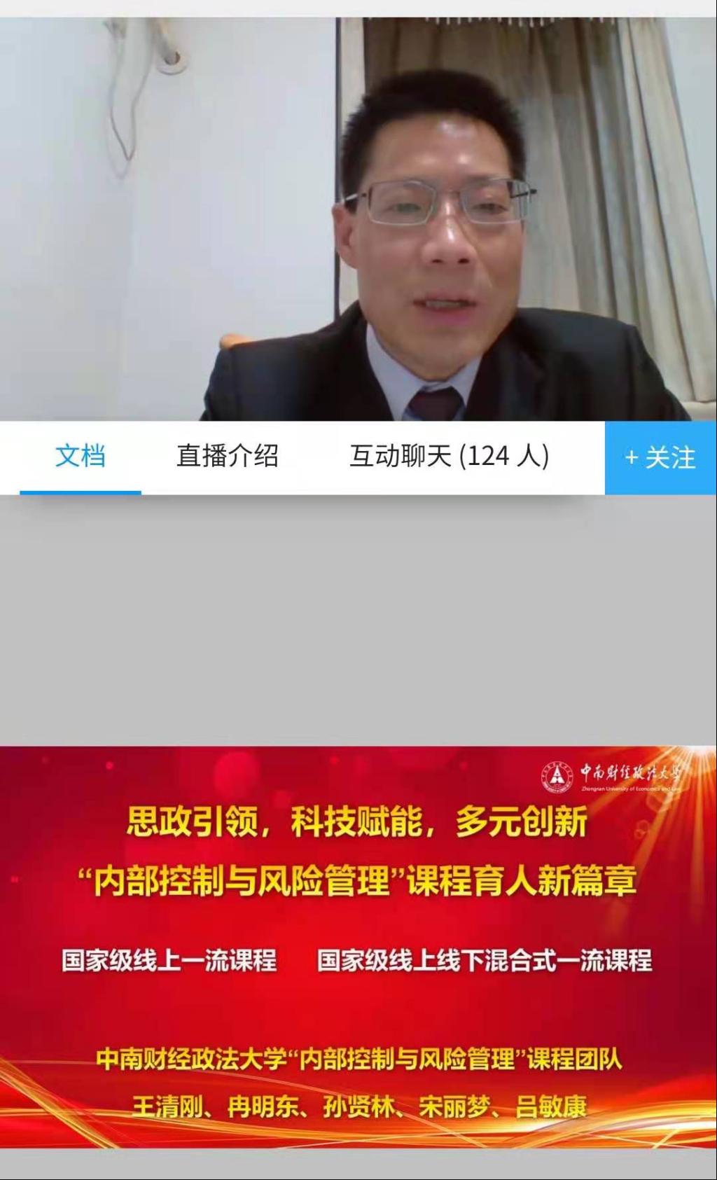 本网讯 (会计学院 供稿)2021年4月29日晚上7:30,会计学院组织学院专任教师收看中南财经政法大学王清刚老师关于“思政引领、科技赋能、多元创新——内部控制与风险管理课程育人新篇章”专题线上讲座。