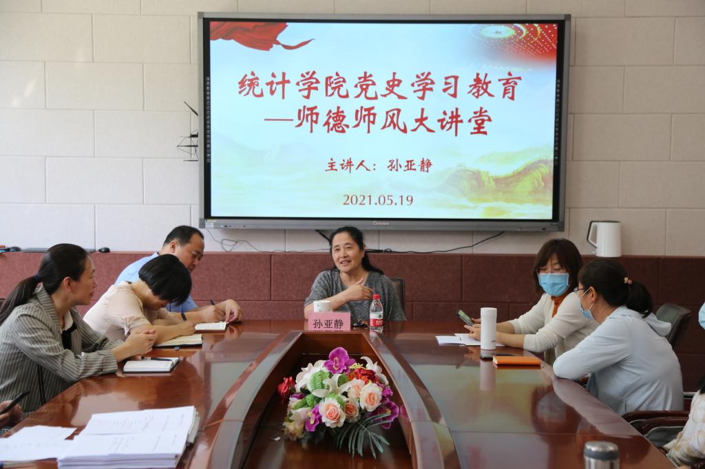 本网讯(统计学院 供稿)为引导学院教师坚定理想信念、厚植爱国情怀、涵养高尚师德,以为党育人、为国育才优异成绩庆祝中国共产党百年华诞。统计学院于5月19日下午在综合楼145会议室举行了在“四史”学习中涵养高尚师德交流会,本次交流会由校“四有”好老师师德建设先进个人孙雅静教授主讲,统计学院党总支书记蒋武鹏主持,统计学院全体教师参加了会议。