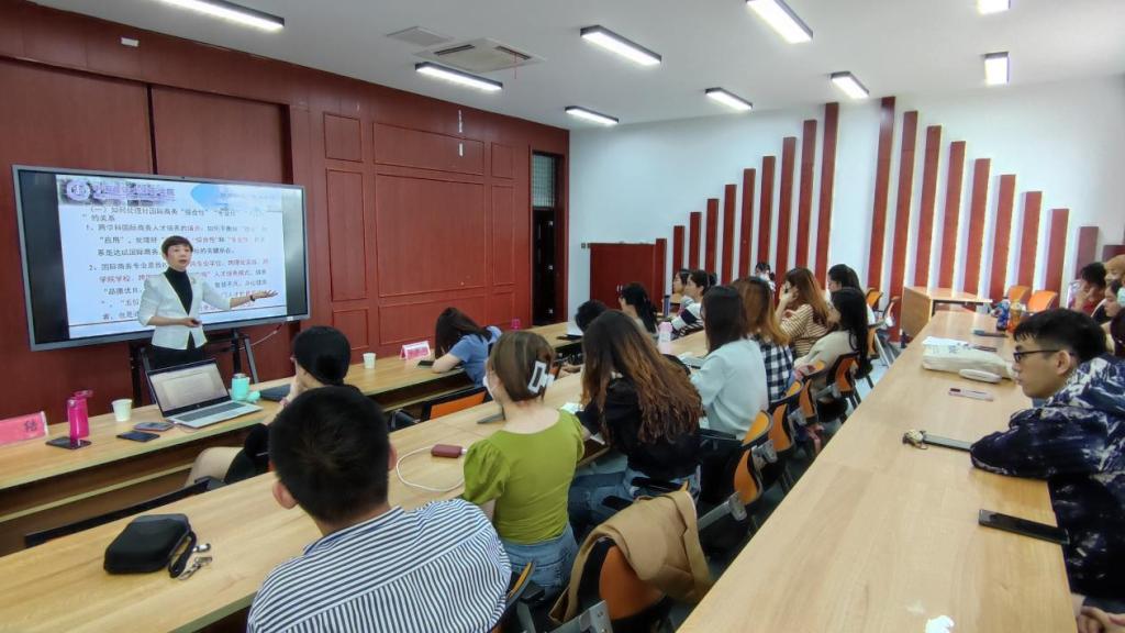 本次交流活动由两场专题报告会和一次专业建设座谈会组成,第一场报告会于6月10日下午在逸夫教学楼2403报告厅举行,宏结教授作了“国际商务‘四跨’人才培养模式的探索与实践”的专题报告。报告会由国际经济贸易学院关嘉麟副院长主持,国际商务教研室教师和2020级研究生参加了报告会。