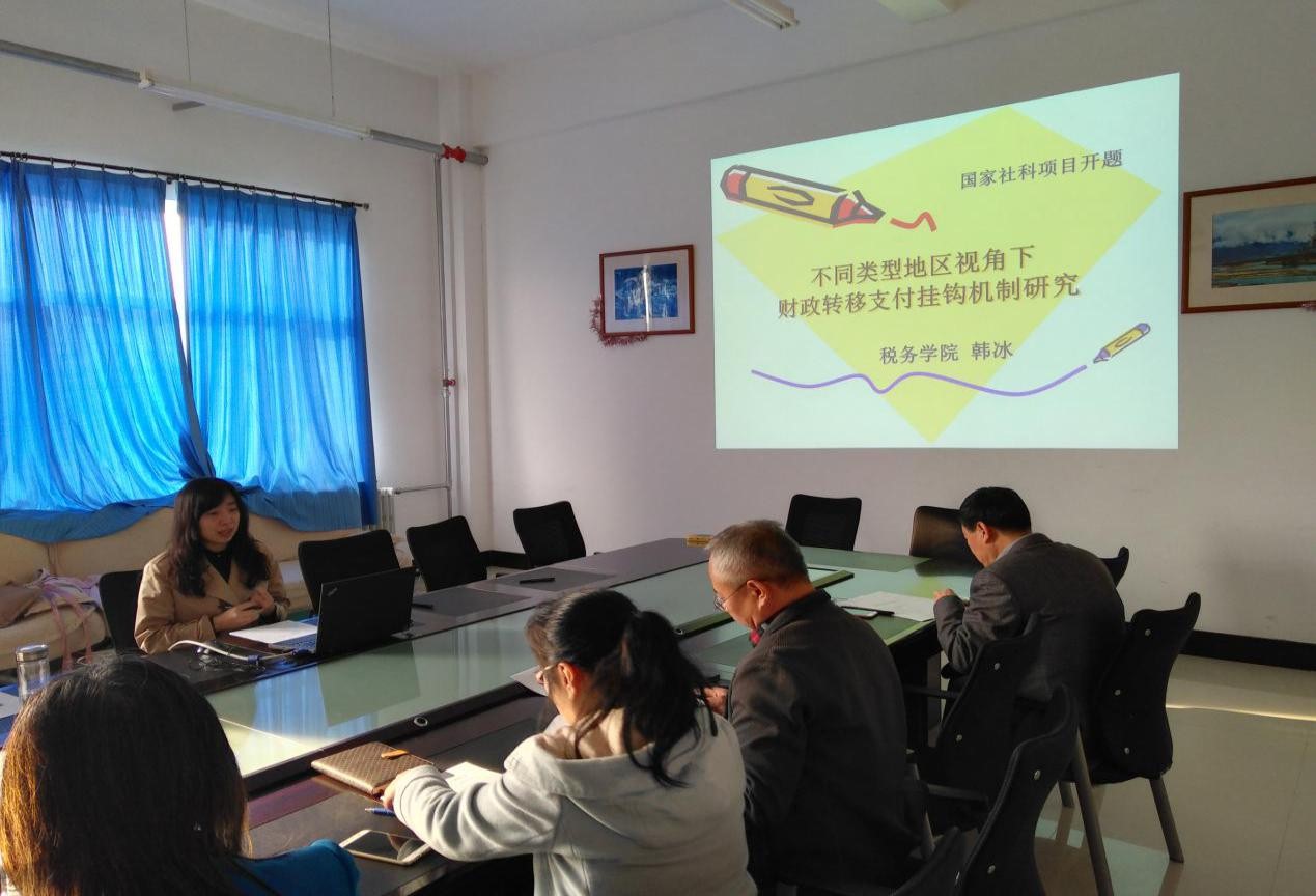 三位承担项目的老师就本人所承担的项目进行了阐述:韩冰老师承担的国家社科项目“不同类型地区视角下财政转移支付挂钩机制研究”和吉林省社科项目“吉林省财政转移支付挂钩机制研究”、郭雅娴老师承担的吉林省社科项目“吉林省地方债务风险预警研究”、王羽老师承担的校级项目“后‘营改增’时代的地方税研究”。答辩委员对三位老师的开题内容给予了充分肯定,并针对科研项目的研究重点和难点提出了指导性建议。