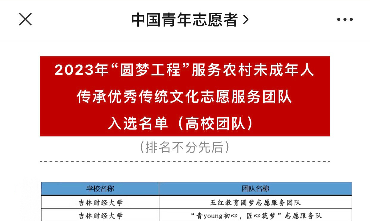 2023年6月,由中央文明办三局、团中央青年志愿者行动指导中心、中国青年志愿者协会秘书处共同开展2023年“圆梦工程”服务农村未成年人传承优秀传统文化志愿服务项目,旨在加强中西部地区农村未成年人思想引领,弘扬中华优秀传统文化。同时,由中国农业发展银行、团中央青年志愿者行动指导中心联合100个县开展2023年全国大学生“乡村振兴”志愿服务项目,旨在全力服务乡村振兴战略,动员引导青年学生投身乡村振兴一线。两个遴选项目公告公布后,校团委积极组织申报,得到各学院大学生志愿服务团队的广泛关注和积极参与,最终,来自公共管理学院、外国语学院、新闻与传播学院、国际经济贸易学院的四支志愿服务团队成功入选,并于暑假期间前往内蒙、云南、吉林等三省四地,按照服务计划,认真准备服务内容,精心设计服务形式,扎实开展好服务农村未成年人传承优秀传统文化志愿服务和乡村振兴志愿服务。