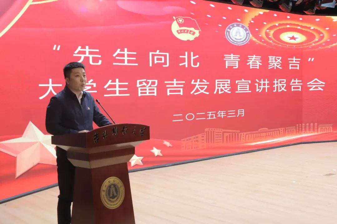 为响应团省委学习宣传贯彻习近平总书记关于东北全面振兴和吉林工作的系列重要指示精神的工作部署,3月26日,校团委在第一教学楼1101报告厅举办团省委“先生向北,青春留吉”大学生留吉发展宣讲报告会。共青团吉林省委社会联络部部长姚明名、共青团吉林省委社会联络部干部董晓琳、孙通法、西部计划“卫国戍边”项目志愿者刘子怡、全体团干部和学生代表参加本次宣讲报告会。