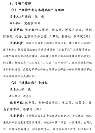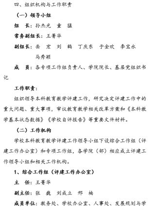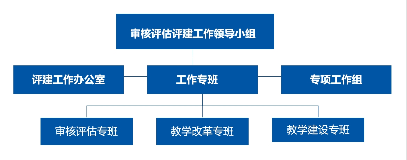 组建由校党委书记、校长任组长的审核评估领导小组,下设评建工作办公室及八个专项工作组。评建工作办公室具体负责学校审核评估工作任务的部署、与推进,组织协调并督促各专项工作组、各教学单位、职能部门按要求完成评建工作任务。专项工作组在评建工作办公室的组织与协调下,按计划完成各项评建任务。