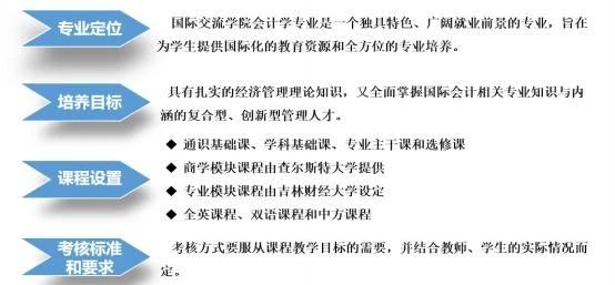 专业定位:中外合作办学会计学专业是一个独具特色、广阔就业前景的专业,旨在为学生提供国际化的教育资源和全方位的专业培养。