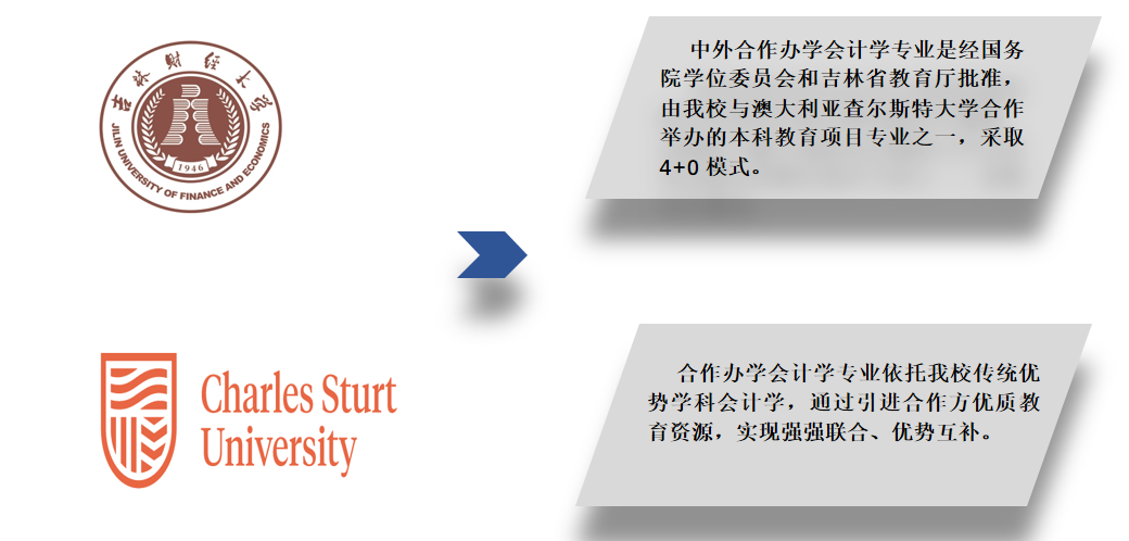 中外合作办学会计学专业是经国务院学位委员会和吉林省教育厅批准,由taptap点点与澳大利亚查尔斯特大学合作举办的本科教育项目专业之一,采取4+0模式。合作办学会计学专业依托taptap点点传统优势学科会计学,通过引进合作方优质教育资源,实现强强联合、优势互补。在该合作办学模式下,学生修满规定学分后,将同时获得taptap点点体育授予的管理学学士学位与澳大利亚查尔斯特大学颁发的商学学士学位,实现了不出国的留学梦想。